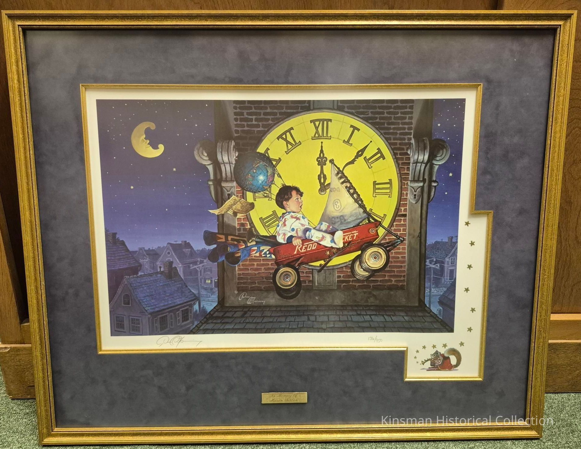 A Sudden Guest small boy in wagon flying across a clock tower by Dean Morrissey (1994). In memory of Aaron Sutton.Cataloged By