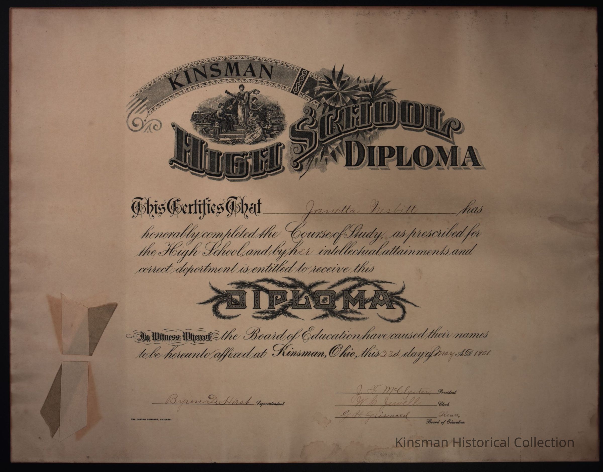 Kinsman High School Diploma This certifies that Janetta Nesbitt has honorably completed the course of study, as prescribed for the high school, and by her intellectual attainments and correct deportment is entitled to receive this diploma. In witness whereof the board of education have caused their names to be hereunto affixed at Kinsman, Ohio, is 23rd day of May A.D. 1901.