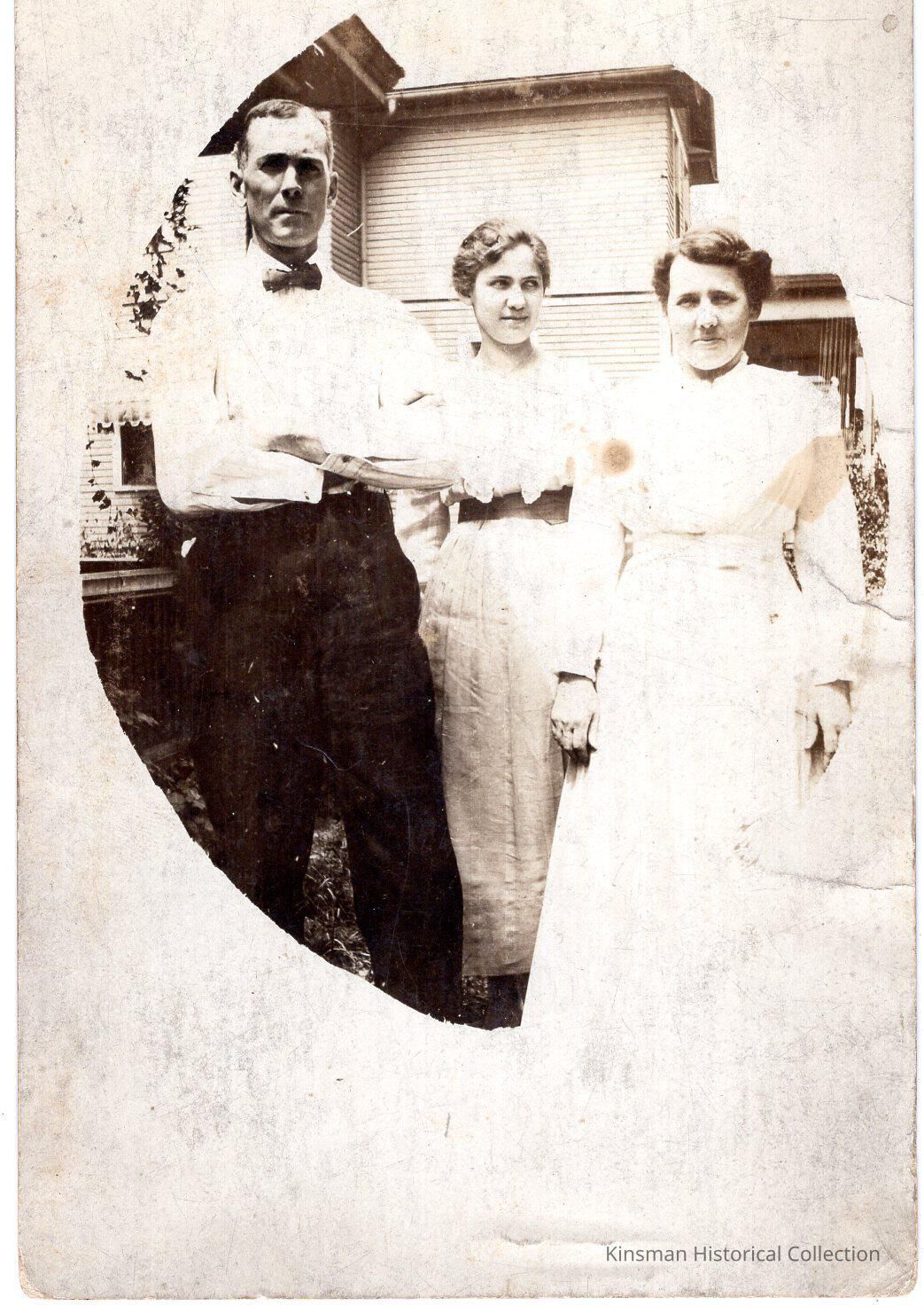 Portrait of three people standing outside. Postcard addressed to Mrs. Jessie Mathews on August 15, 1916.Collection