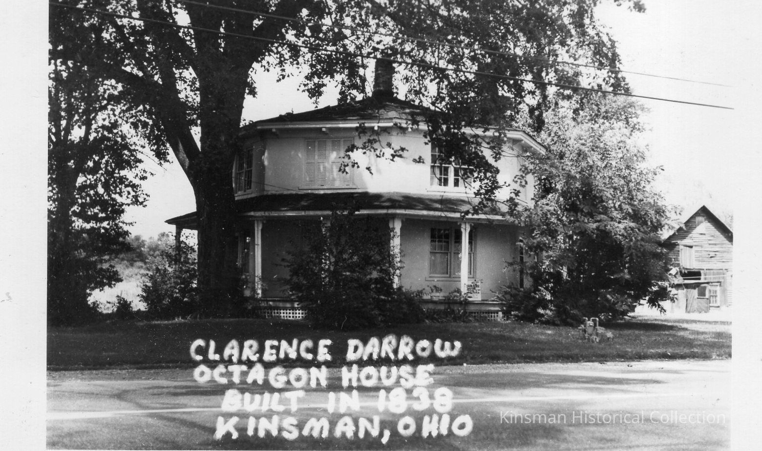 Tree shaded exterior of "Clarence Darrow Octagon House Built in 1838 Kinsman, Ohio".Collection