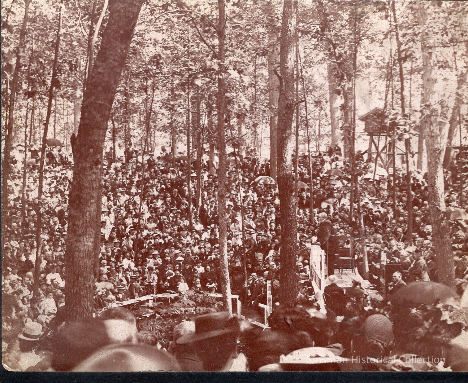Dwight L. Moody preaching to an amphitheater packed full of people outside of Kinsman in a natural crater in a field. Wooden stage and plank seating were built for the event held on old Fairgrounds in Kinsman. Also known as "camp meetings".Collection