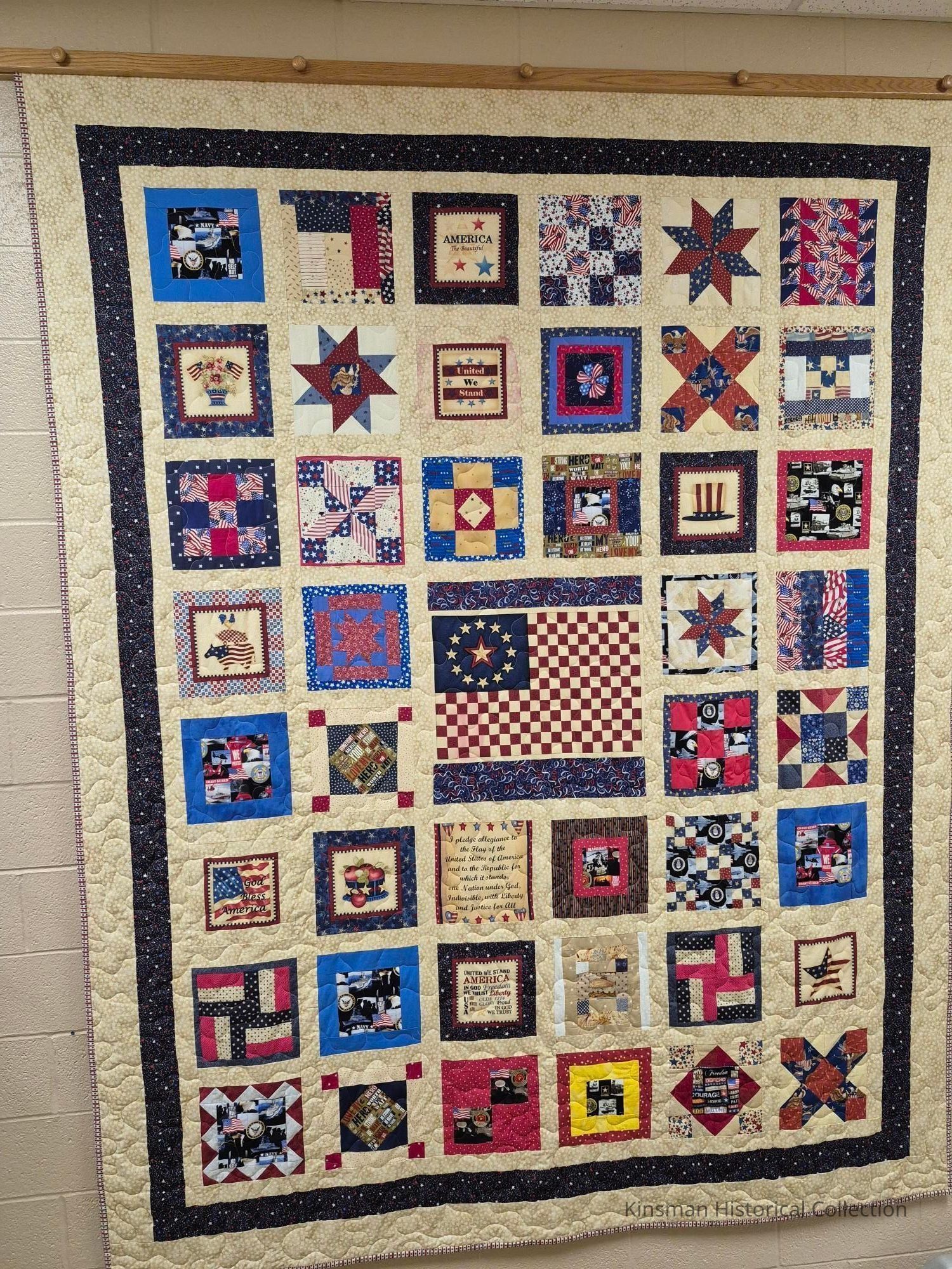 Patriotic stars and stripes quilt made by The Kinsman Country Quilters and donated by Kinsman American Legion Post #506 and the Merrow Family in 2017.Cataloged By