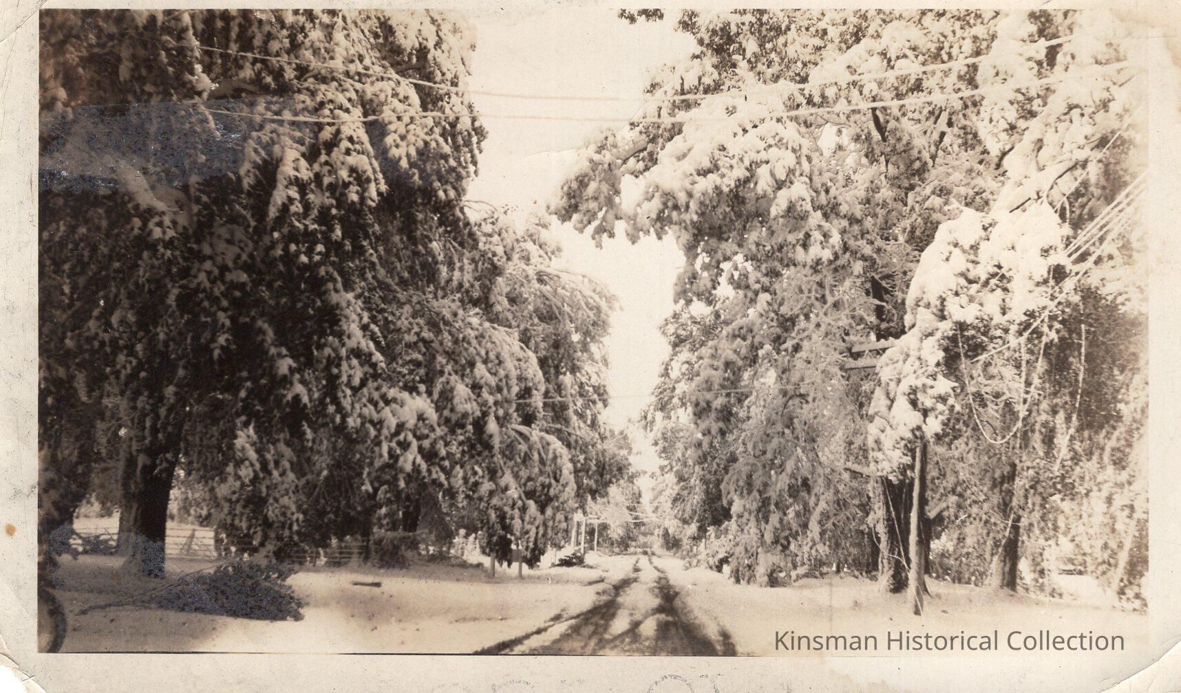 Snowy tree line roadway described as being in "front of Roots house".Cataloged By