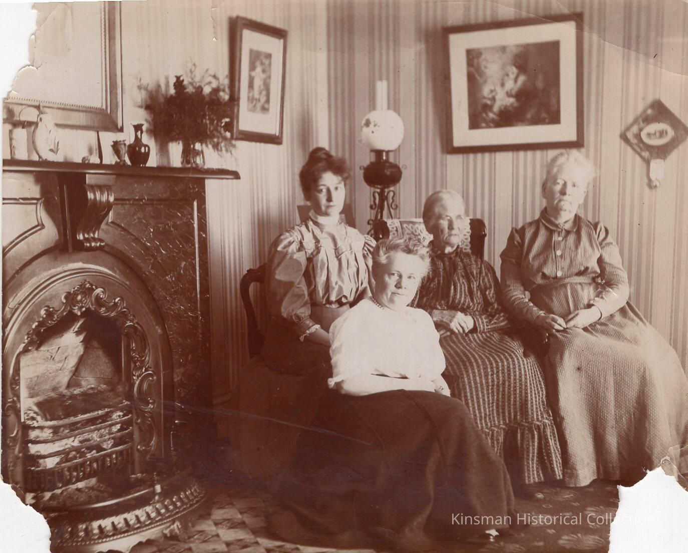 Four women seated next to the fireplace in the parlor of the Thomas Kinsman Sr. home seated from left to right next to the fireplace as his niece Margery Burnham, daughter Mary B. Kinsman, wife Sophia and daughter Sophia B.Collection