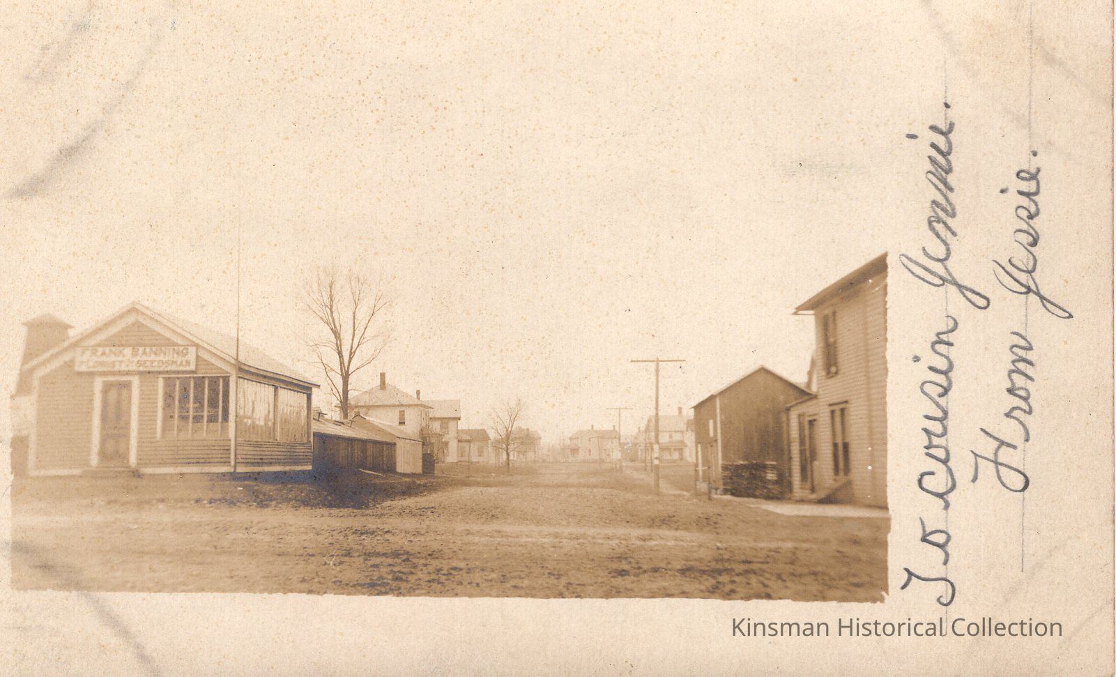 Wide roadway with Frank Banning Florist and Seedsman building off to the left. Looking down Elm Street from Main Street East. Identified on the back as "Banning Greenhouse- later became post office".Cataloged By