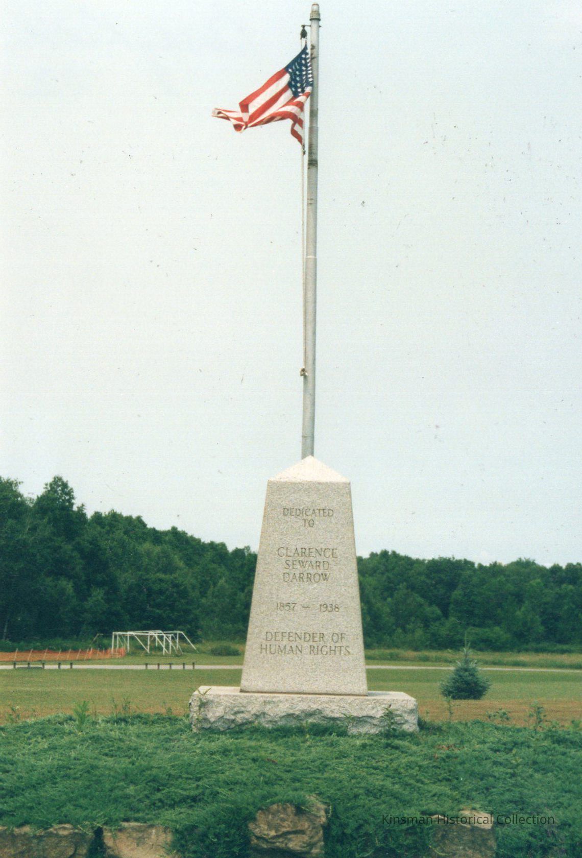 Stone monument with American flag pole "Dedicated to Clarence Seward Darrow 1857-1938 Defender of Human Rights". Located in Kinsman Park.Cataloged By