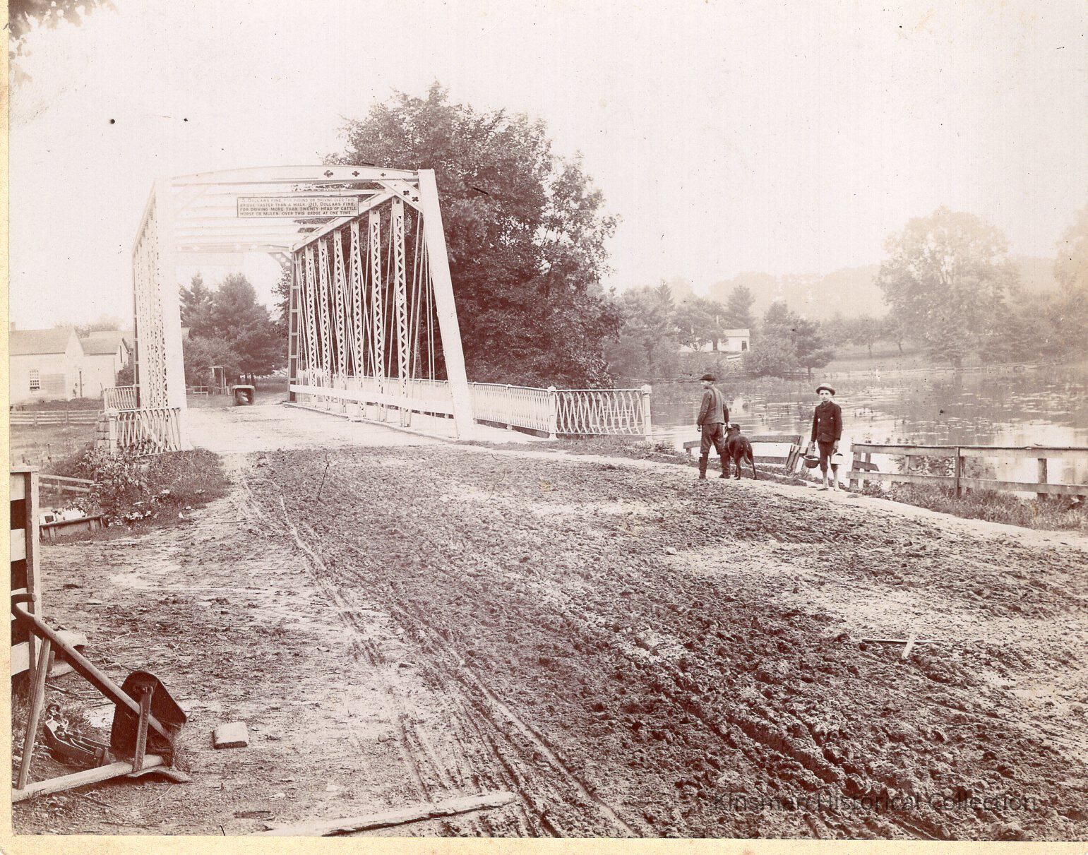 Two boys and a dog standing along the dirt roadway leading to the Steel Bridge "Pymatuning Bridge" in Kinsman, Ohio circa 1900.Cataloged By