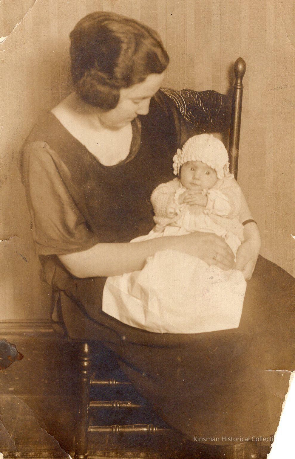 Portrait of a seated woman hold a baby identified as Joan Mae Marvin aged 7 weeks and 2 days old.Collection