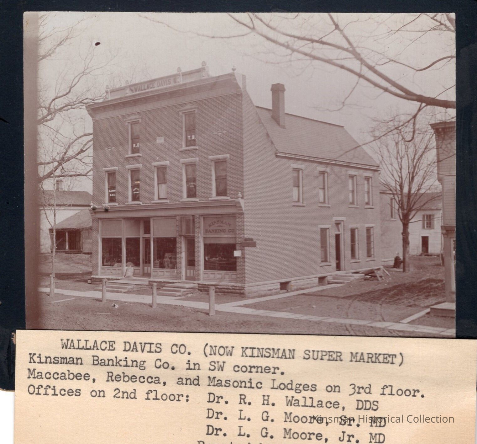 Exterior of The Wallace Davis Company building which included Kinsman Banking Company in the southwest corner, Maccabee, Rebecca, and Masonic Lodges on the third floor, and office on the second floor, Dr. R. H. Wallace, DDS, Dr. L. G. Moore, Sr. MD, and Dr. L. G. Moore, Jr. MD.Cataloged By