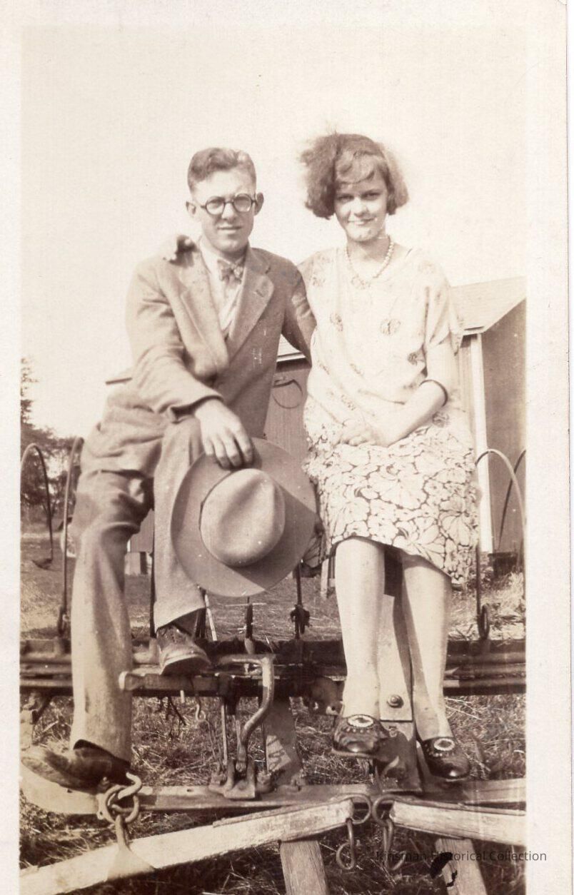 Couple sitting on farm equipment.Collection