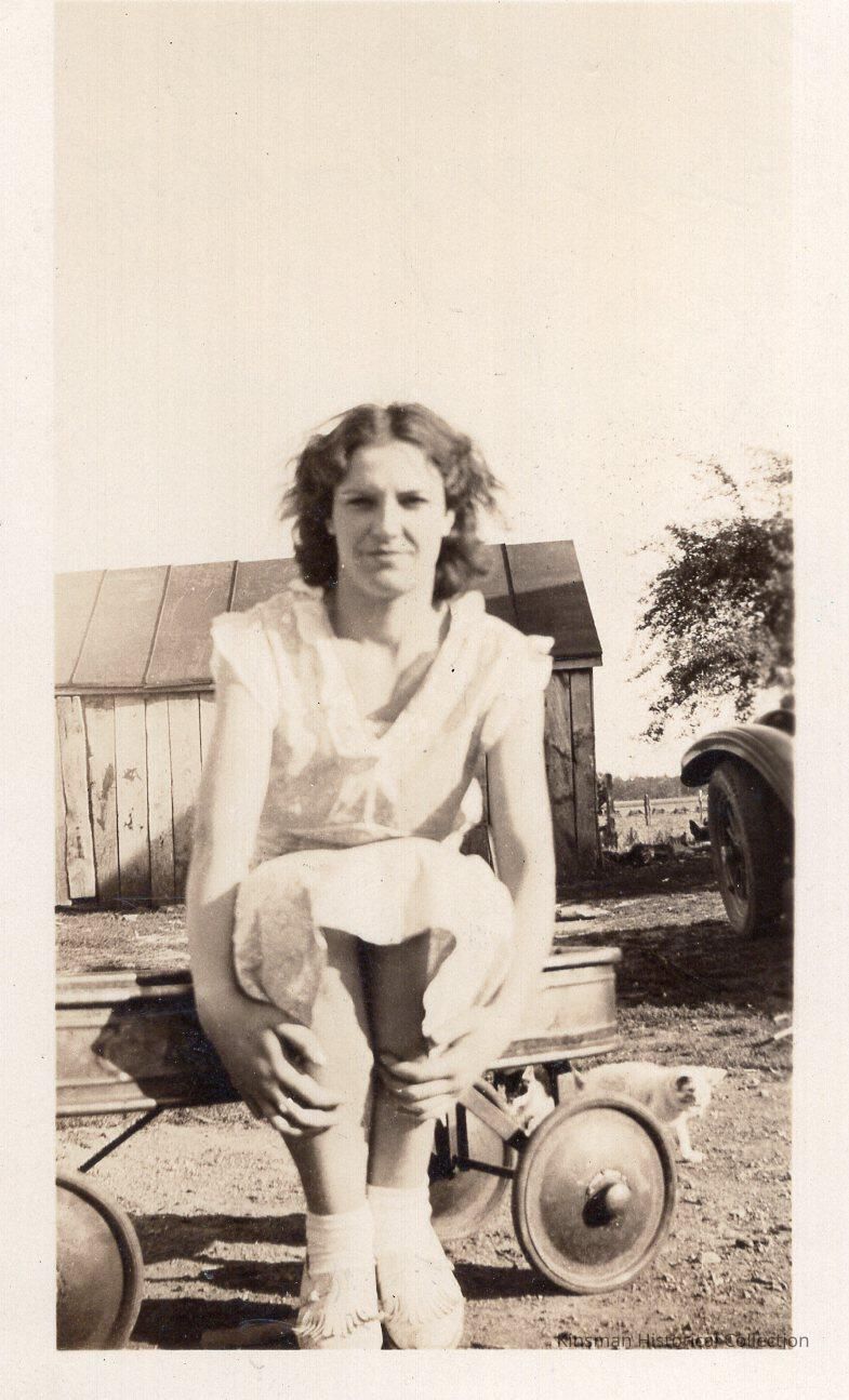 Portrait of a women sitting on a wagon originally identified as "Mrs. Robison Feb, 17-1939" but then corrected to "Hazel Draa".Collection
