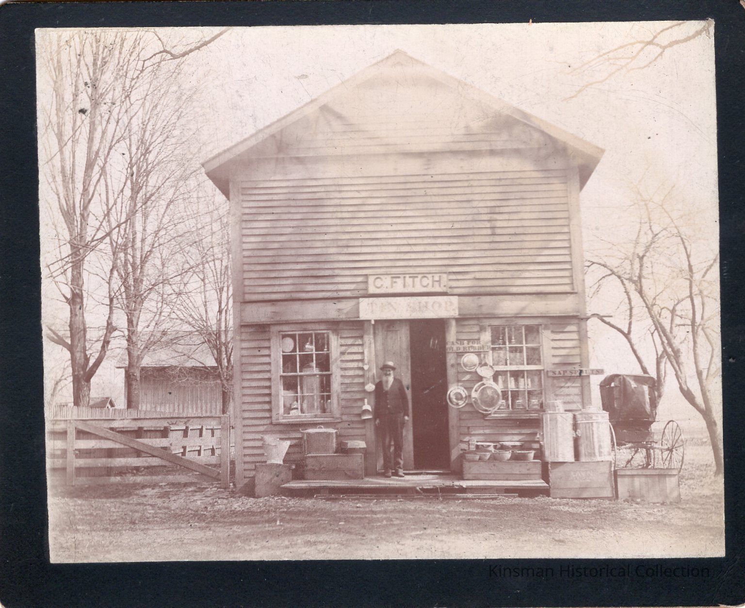 Man standing in front of C. Fitch Tin Shop, taken on March 28, 1896. Identified on back as "Uncle Charles Ray's Tin Shop".Cataloged By