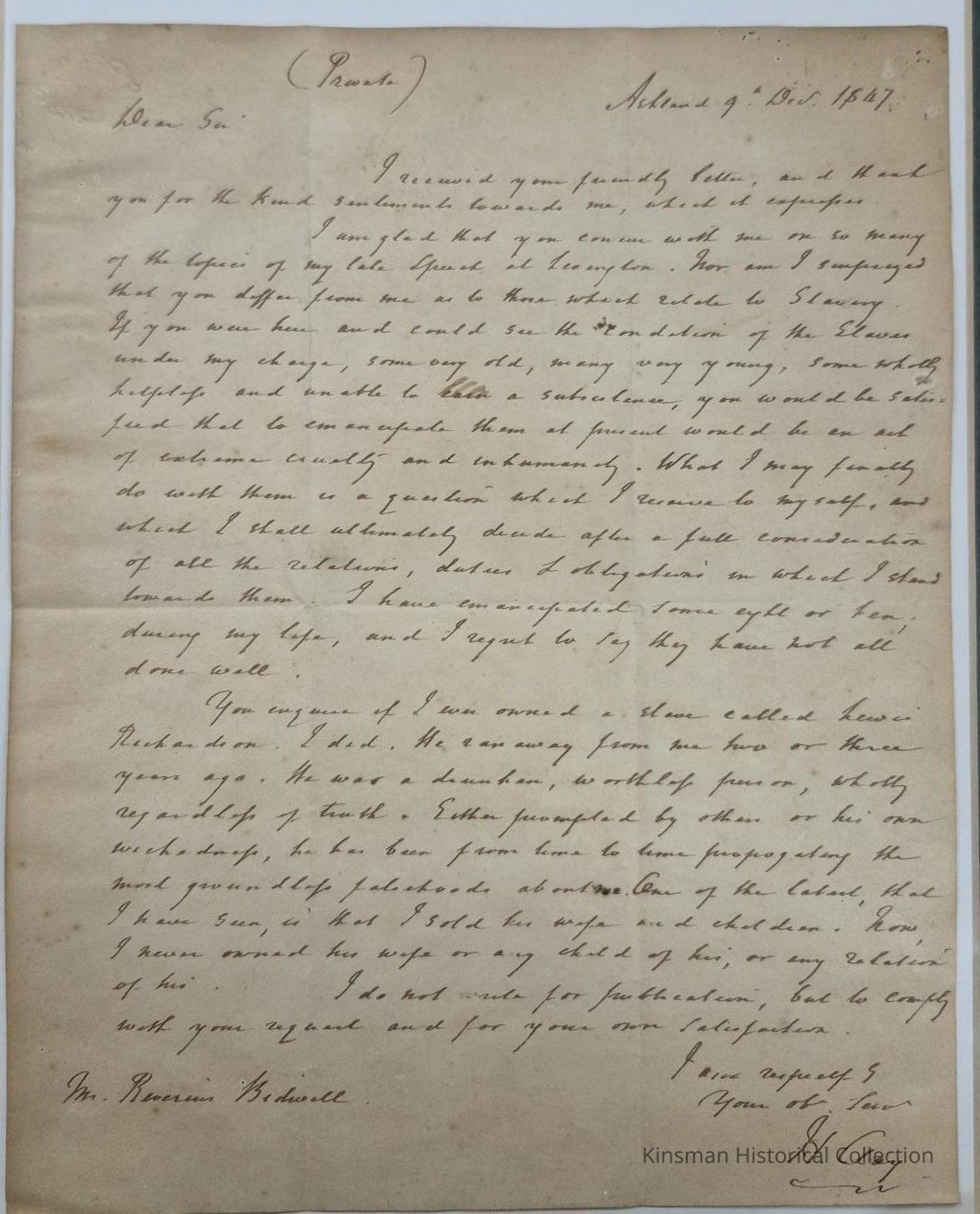 Letter from Henry Clay to Riverius Bidwell dated December 9, 1847 concerning emancipation. Given to Kinsman Library by Myra K. Pelton in December 1935 and given to Myra by Eunicia Hotchkiss, wife of Riverius Bidwell.