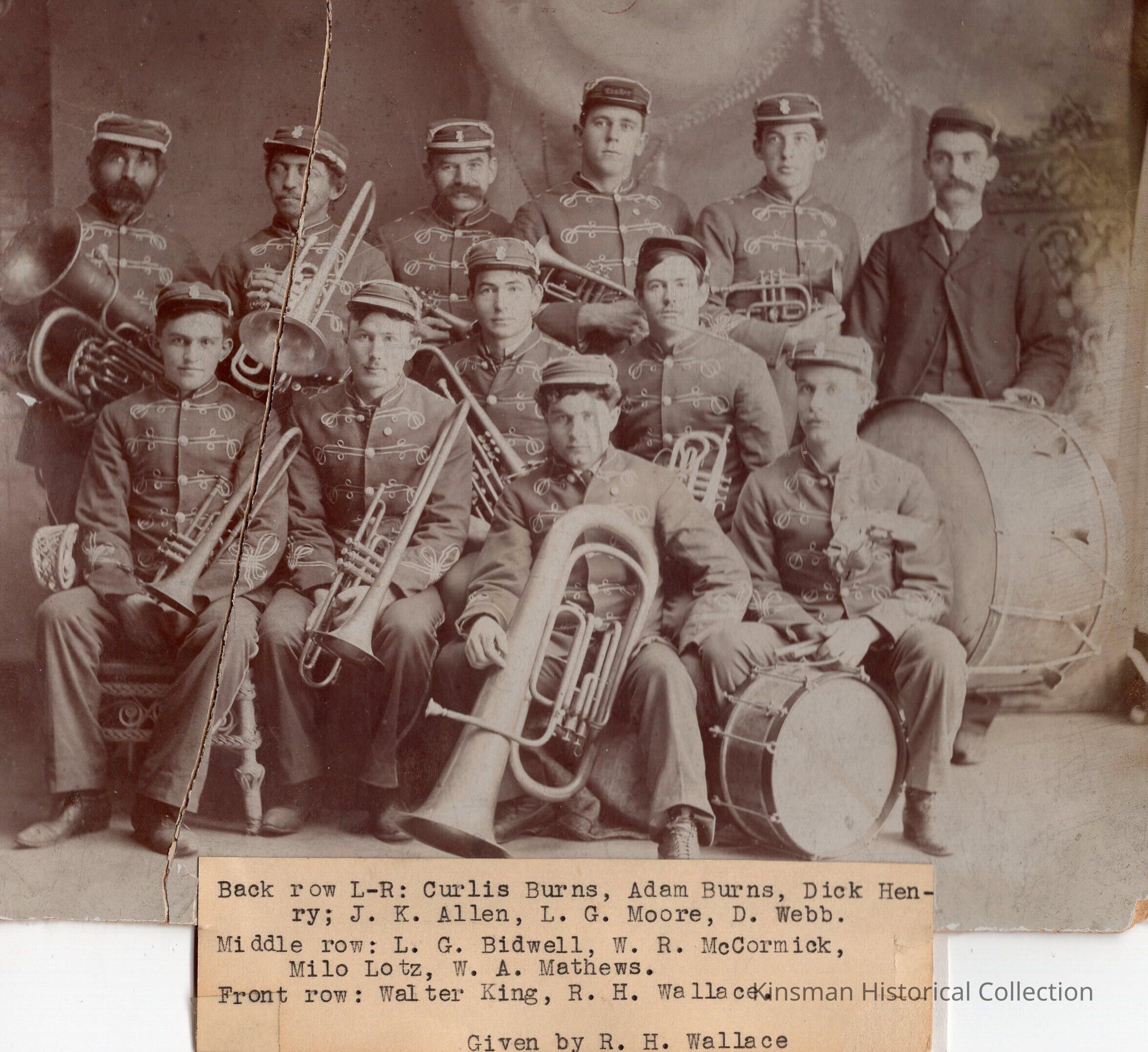 Kinsman Band identified left to right as back row: Curlis Burns, Adam Burns, Dick Henry, J. K. Allen, L. G. Moore, and D. Webb.