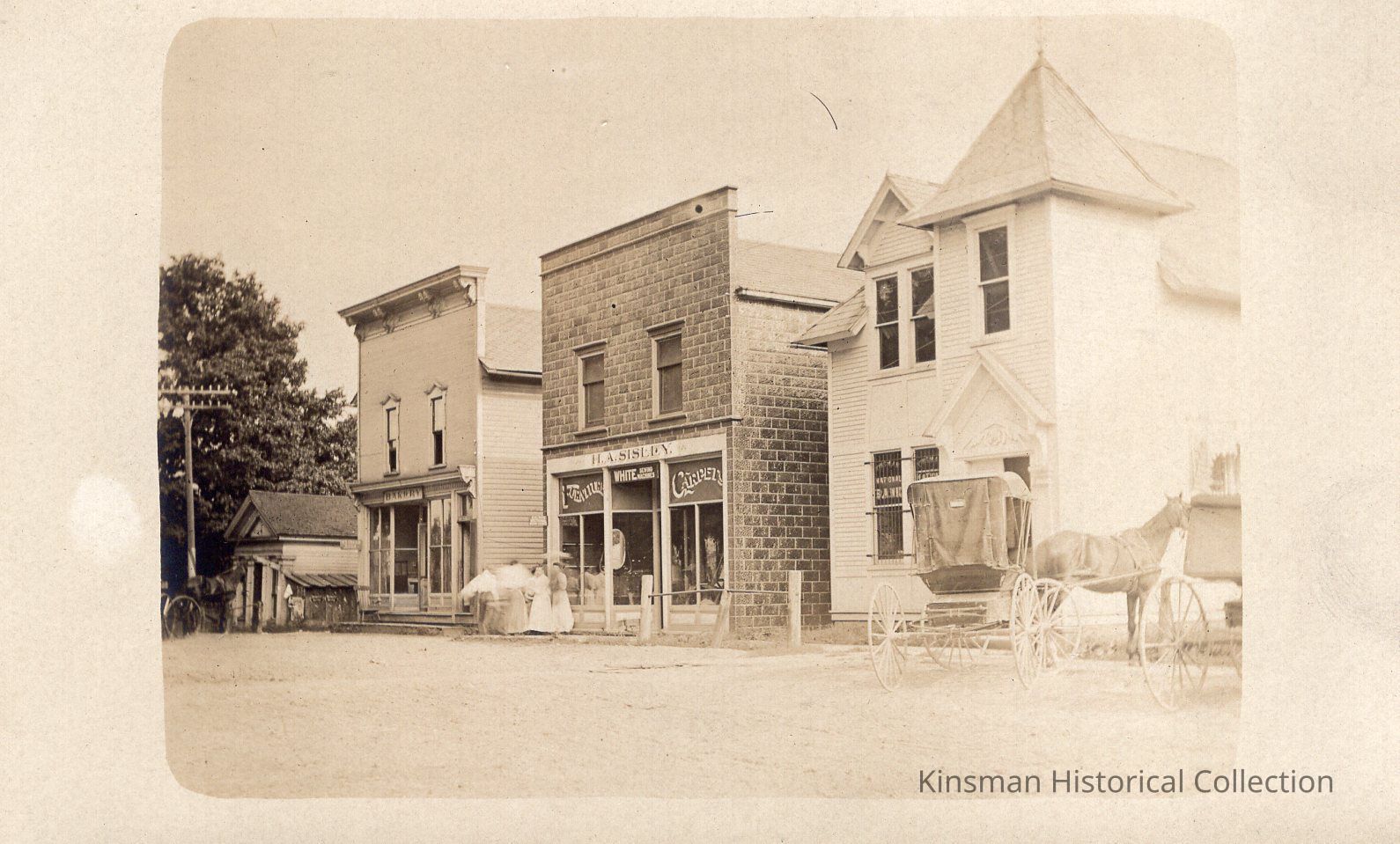 Group of people and horse drawn carriage in front of a row of Kinsman Square businesses including a bakery, H. A. Sisley Furniture and Carpets, and Kinsman National Bank.Collection