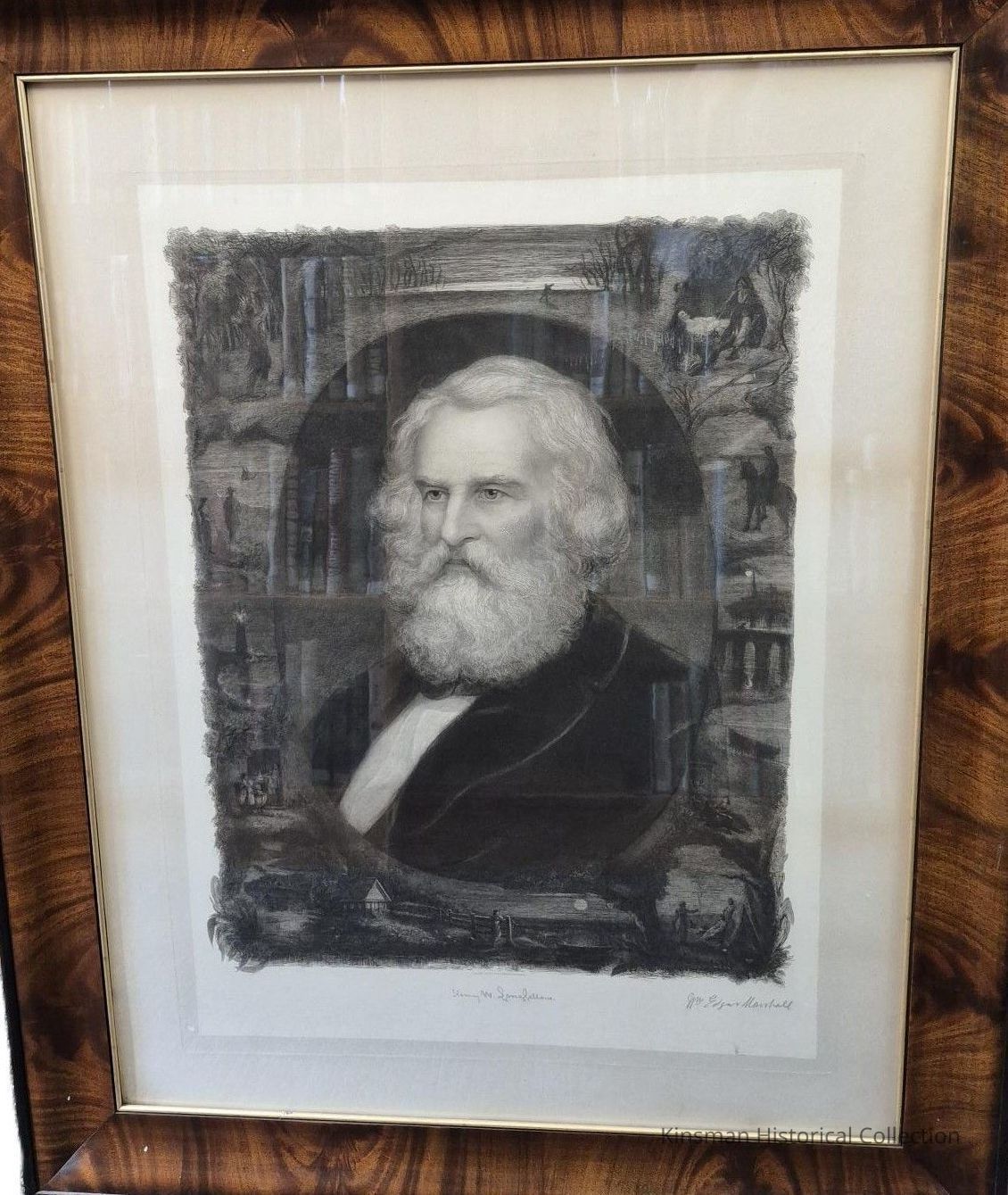 Portrait of Henry Wadsworth Longfellow (1807-1882) with surrounding illustrations by Edgar Marshall.Cataloged By
