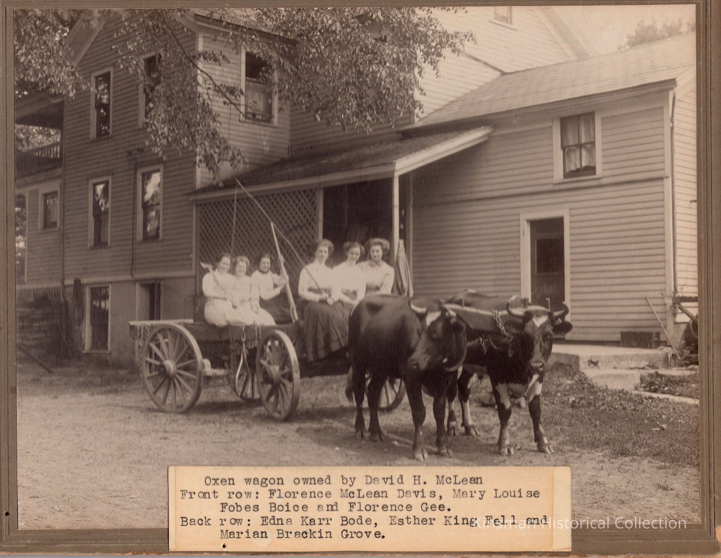 Group of women sitting in an oxen wagon owned by David H. McLean. Front row: Florence McLean Davis, Mary Louise Fobes Boice, and Florence Gee.