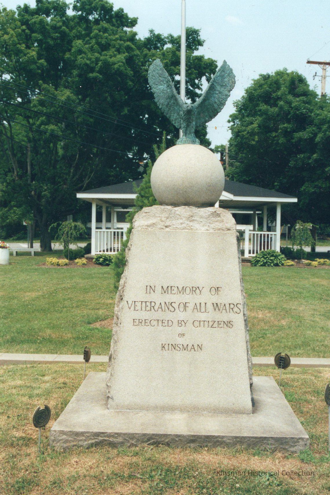 Stone monument with rounded sphere and eagle on top "In Memory of Veterans of All Wars Erected by Citizens of Kinsman". Located in Kinsman Square in front of the bandstand.Cataloged By