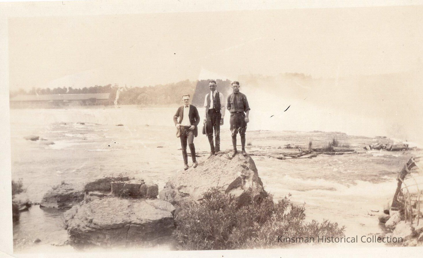 Three men standing on a rock in front of waterfall.Collection