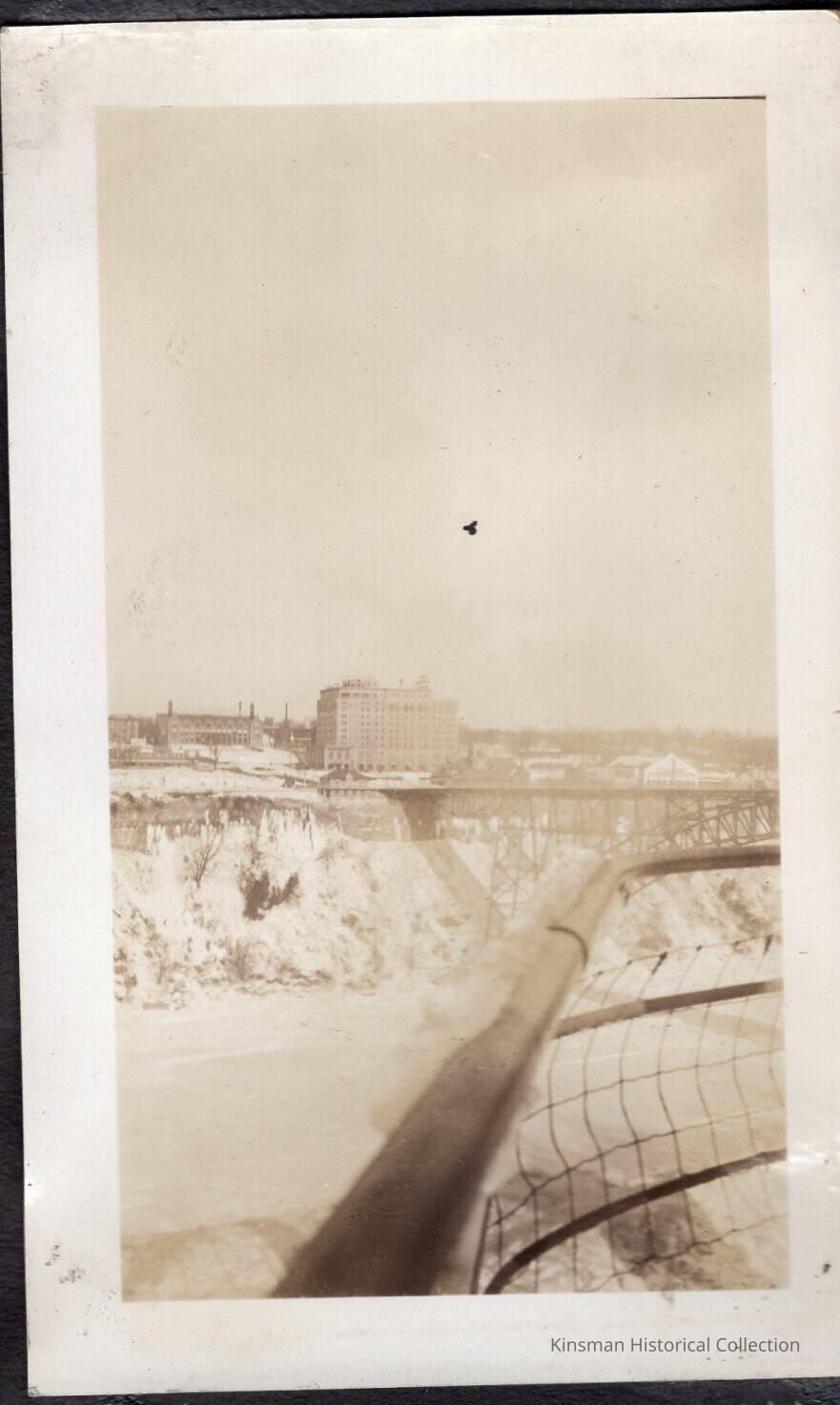 Landscape of building across a river with a railing in the foreground.Collection