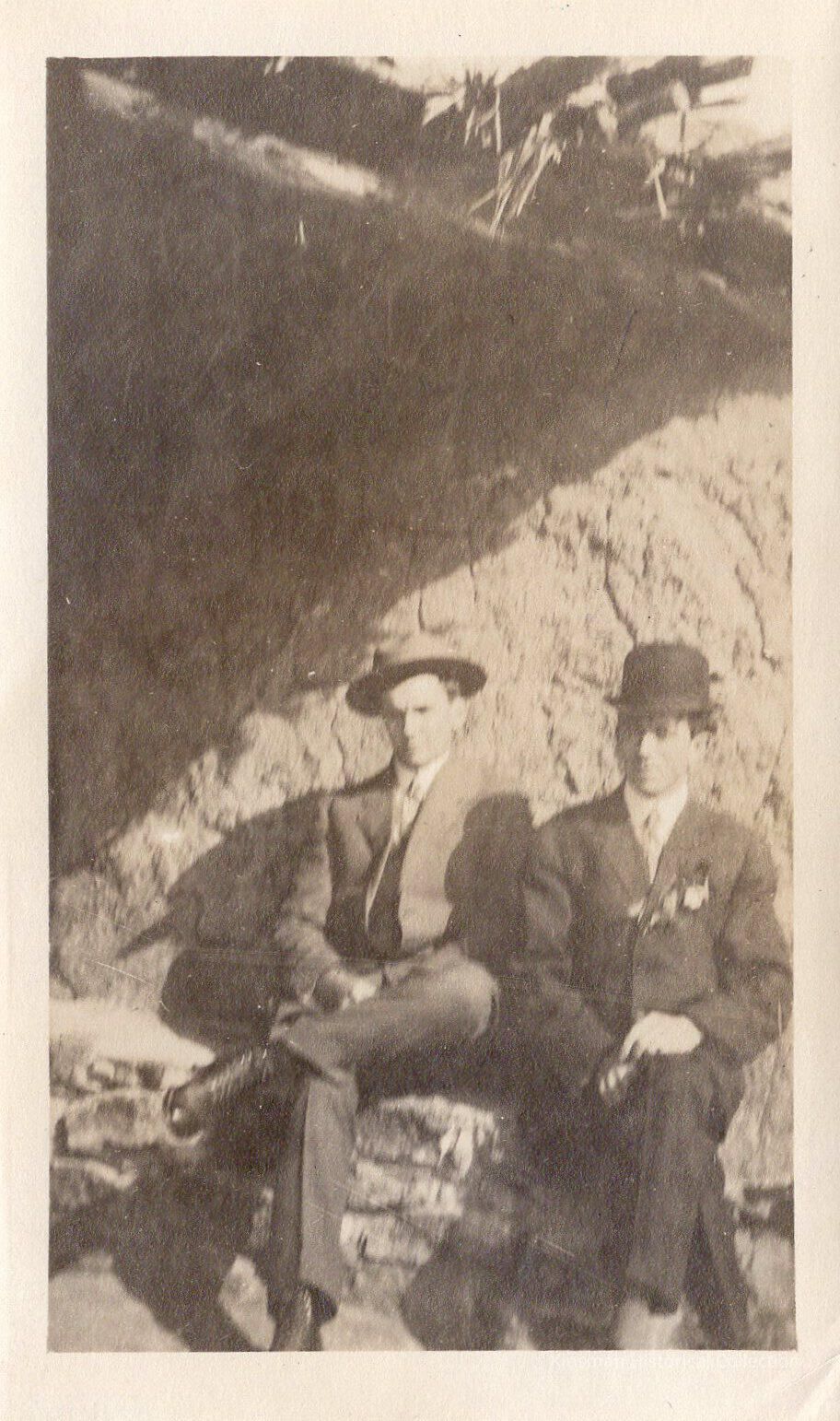 Two men sitting on a stone bench by an outdoor structure.Collection