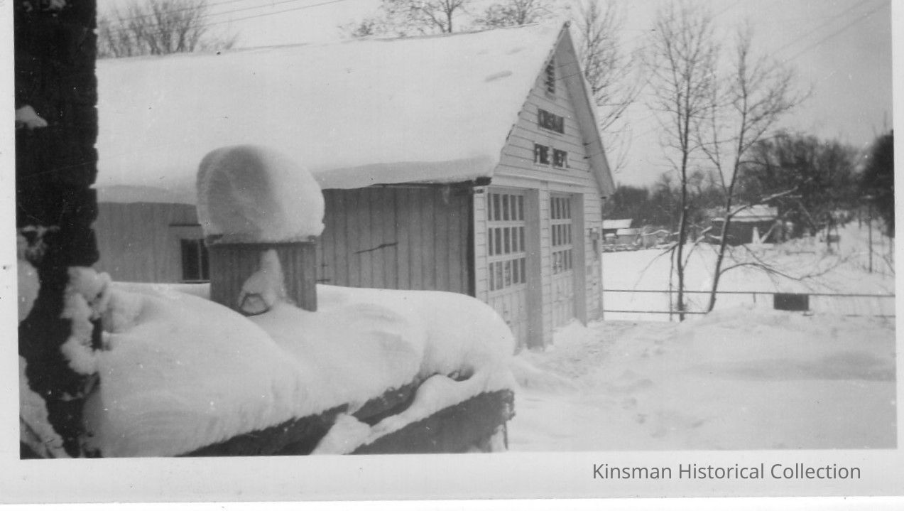 The Kinsman Fire Department building covered in a heavy snow, dated on back as December 12, 1944.Collection
