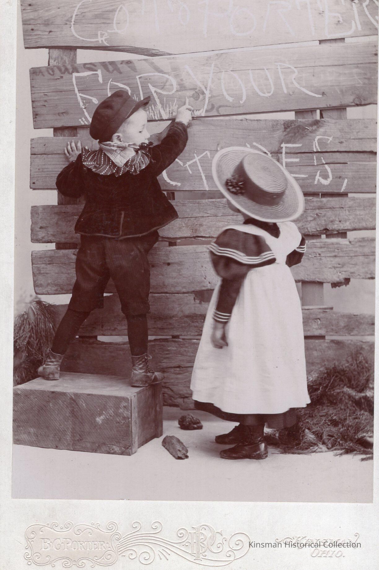 Two children identified as Archie Pool and Marian Bracken by a sign that possibly says "Go to Porters for your pictures" advertising the photographer B.C. Porter of Kinsman, Ohio in the 1896 Kinsman Fair Catalog.Cataloged By