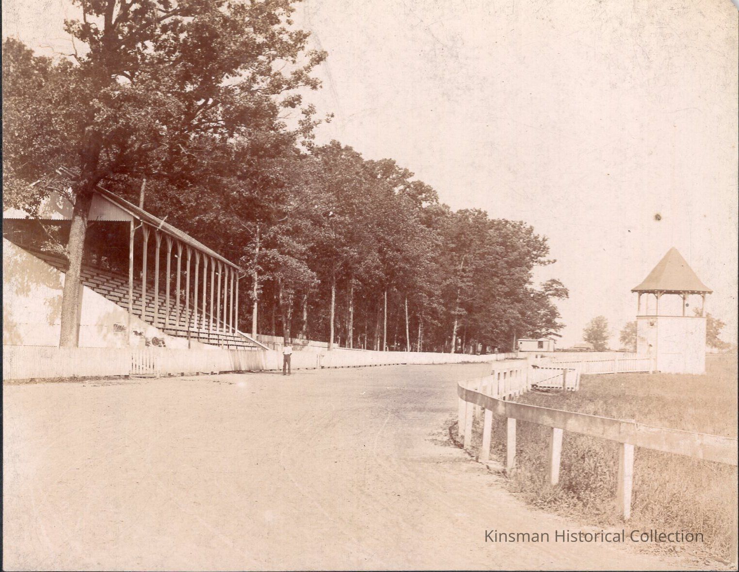 Man standing in front of empty stands on a dirt track at the Kinsman Fair Grounds.Collection