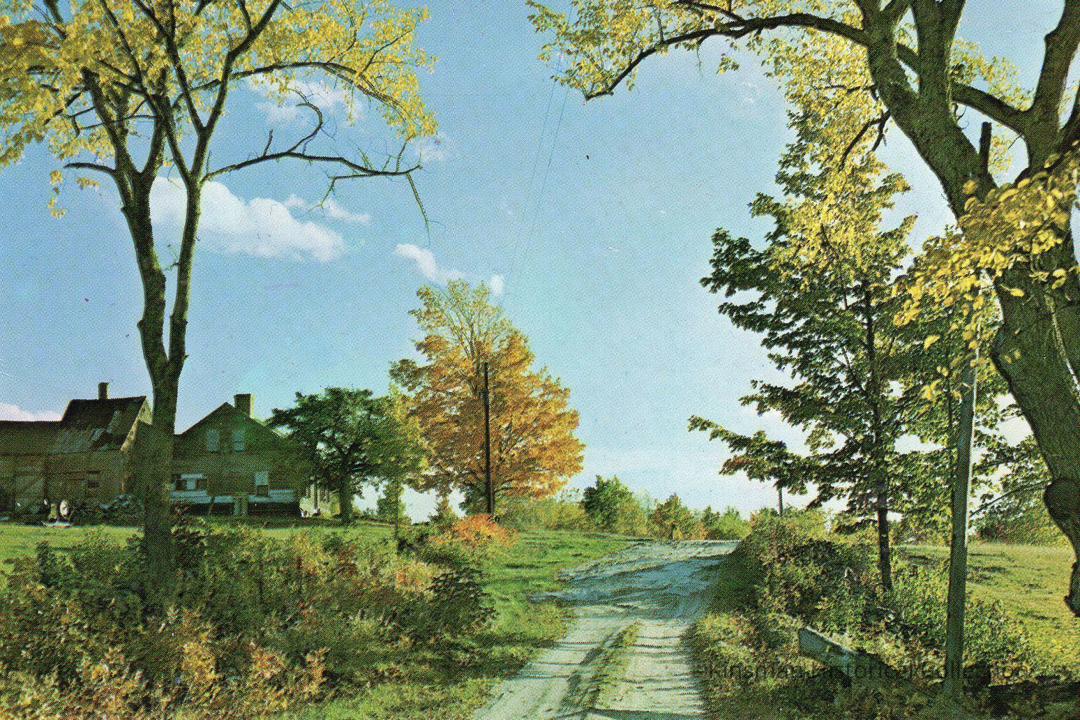 Unidentified country road "Country Splendor" lake surrounded by trees with "Greetings from Kinsman, Ohio.Cataloged By