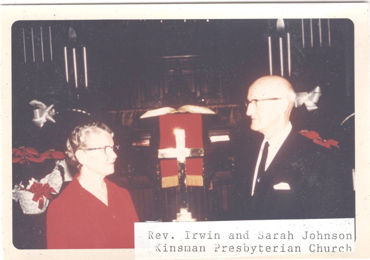 Rev. Irwin and Sarah Johnson standing in front of a poinsettia decorated alter at Kinsman Presbyterian Church.Collection