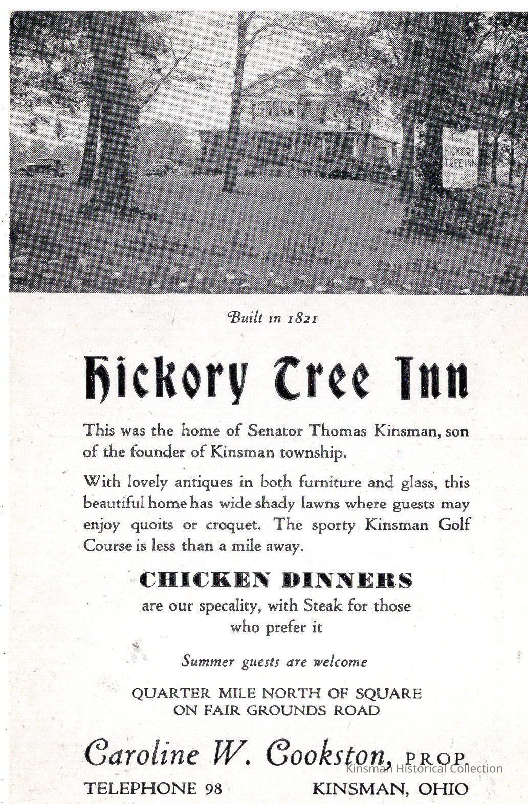 "This was the home of Senator Thomas Kinsman, son of the founder of Kinsman township. With lovely antiques in both furniture and glass, this beautiful home has wide shady lawns where guests may enjoy quoits or croquet. The sporty Kinsman Golf Course is less than a mile away. Chicken dinners are our specialty, with Steak for those who prefer it. Summer guests are welcome. Quarter mile north of square on Fair Grounds Road. Caroline W. Cookston, Prop. telephone 98 Kinsman, Ohio."Cataloged By