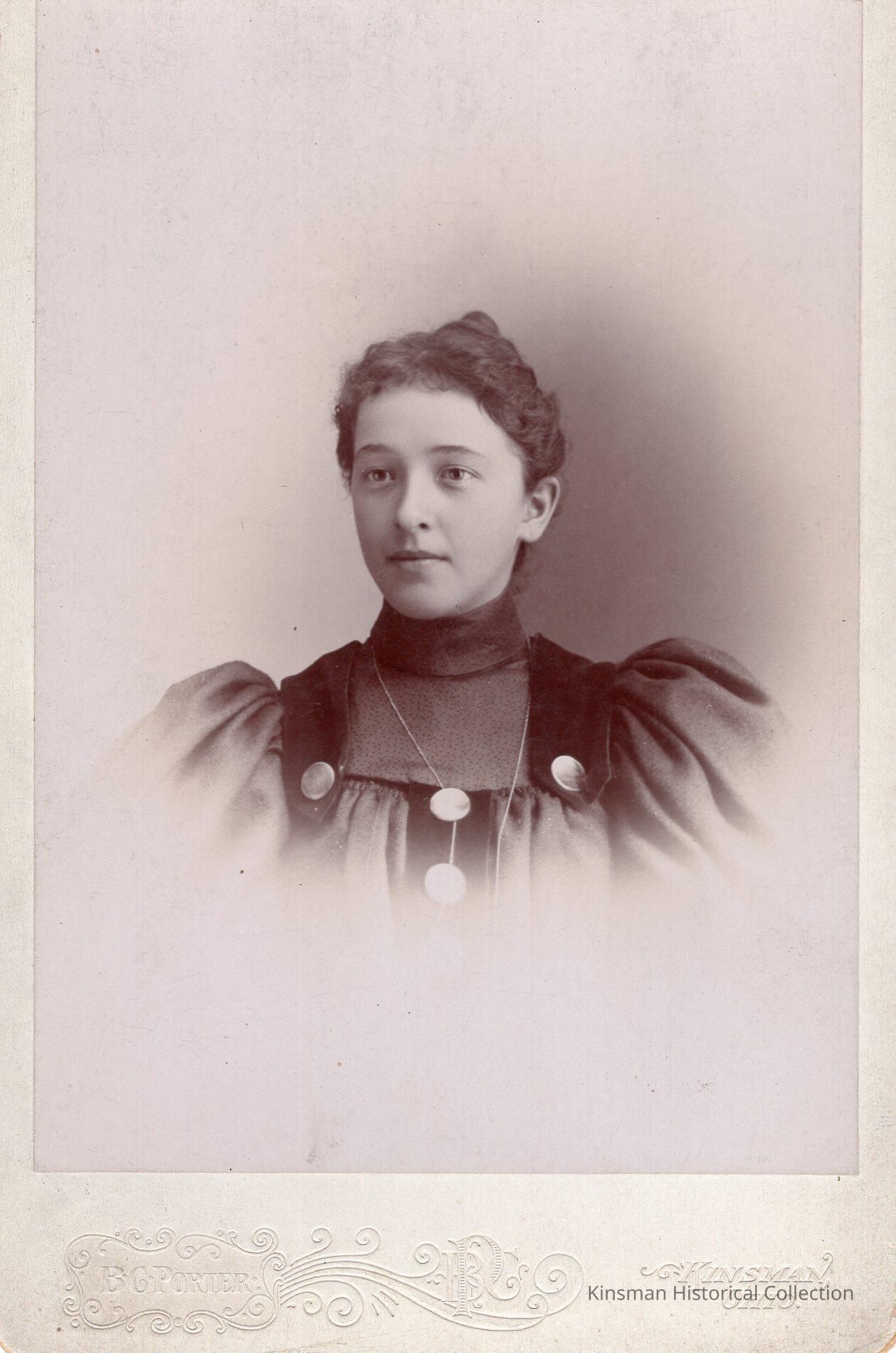 Portrait of Minnie Moore, daughter of Dr. S. G. Moore (2022.1.62) of Kinsman, Ohio.Cataloged By