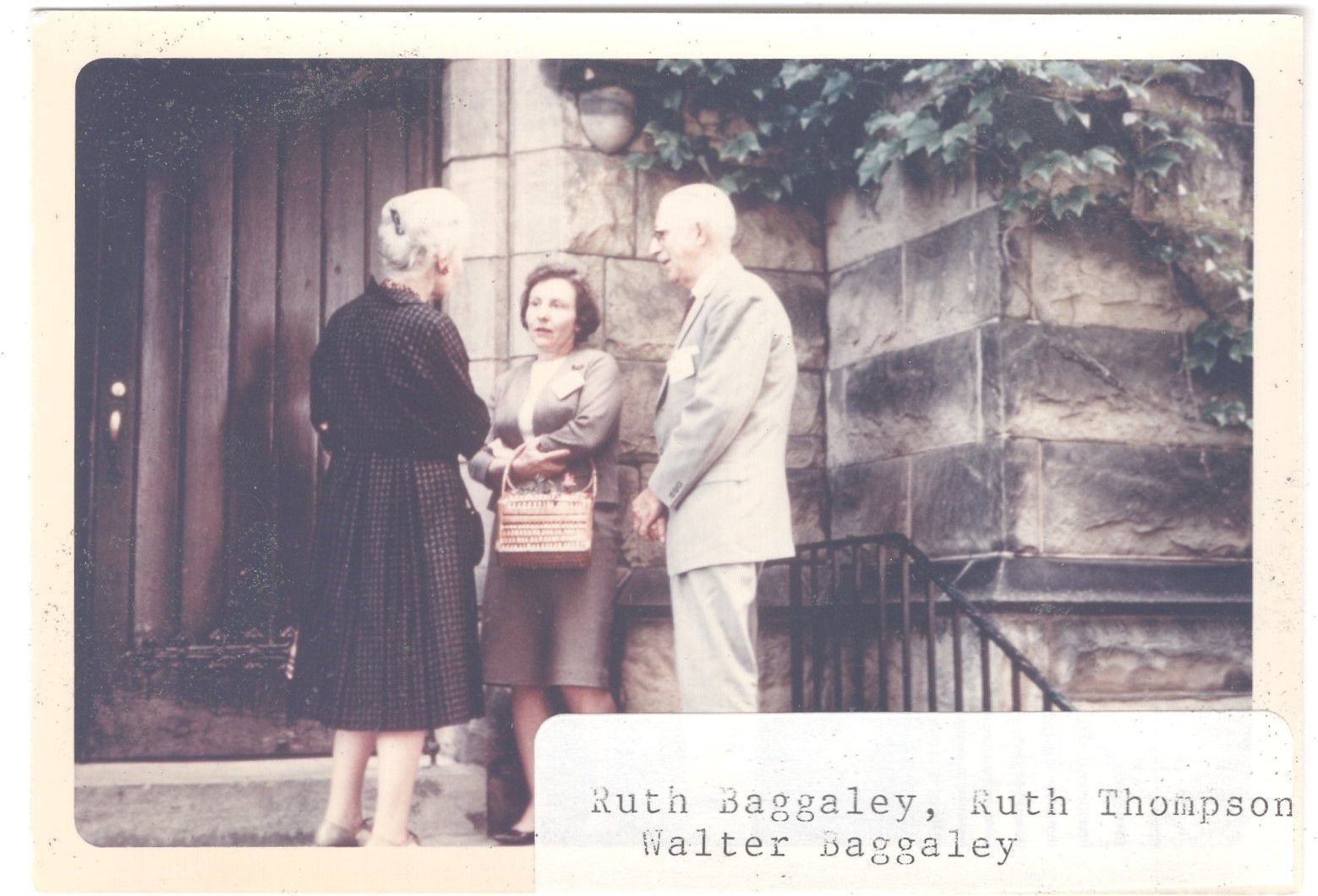 Small group conversing on stone steps identified as Ruth Baggaley, Ruth Thompson, and Walter Baggaley.Cataloged By