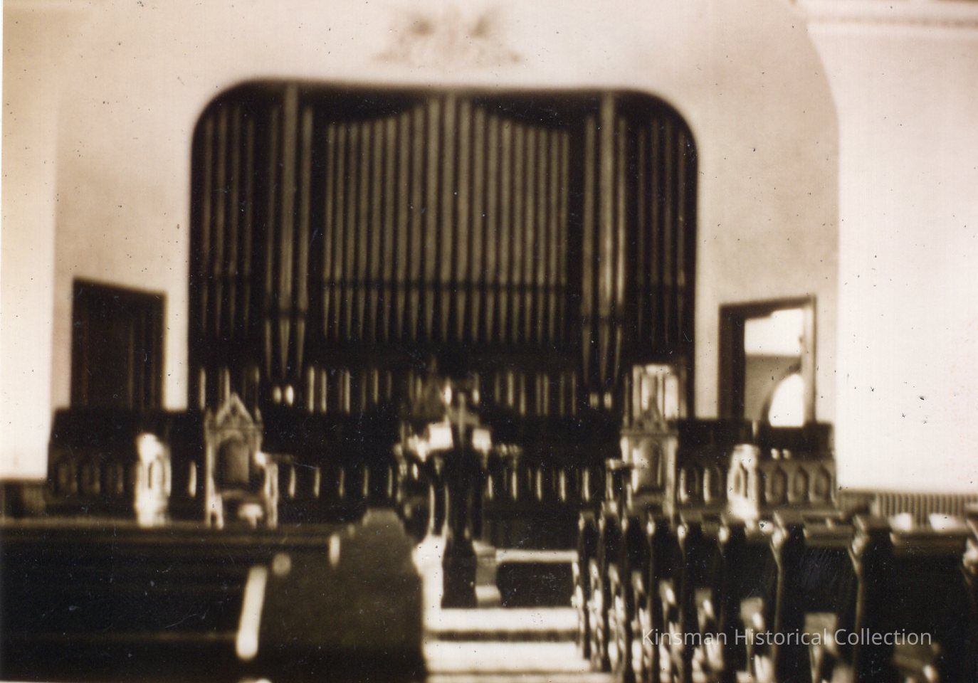 Interior of a church taken down the middle aisle of pews.Cataloged By