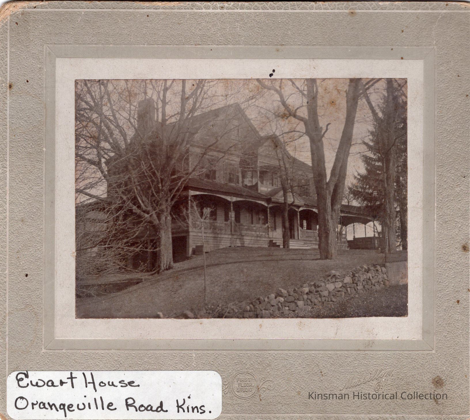 The Ewart House, originally the Yeoman House, on Kinsman-Orangeville Road. Surrounded by bare trees and a stone wall.Cataloged By