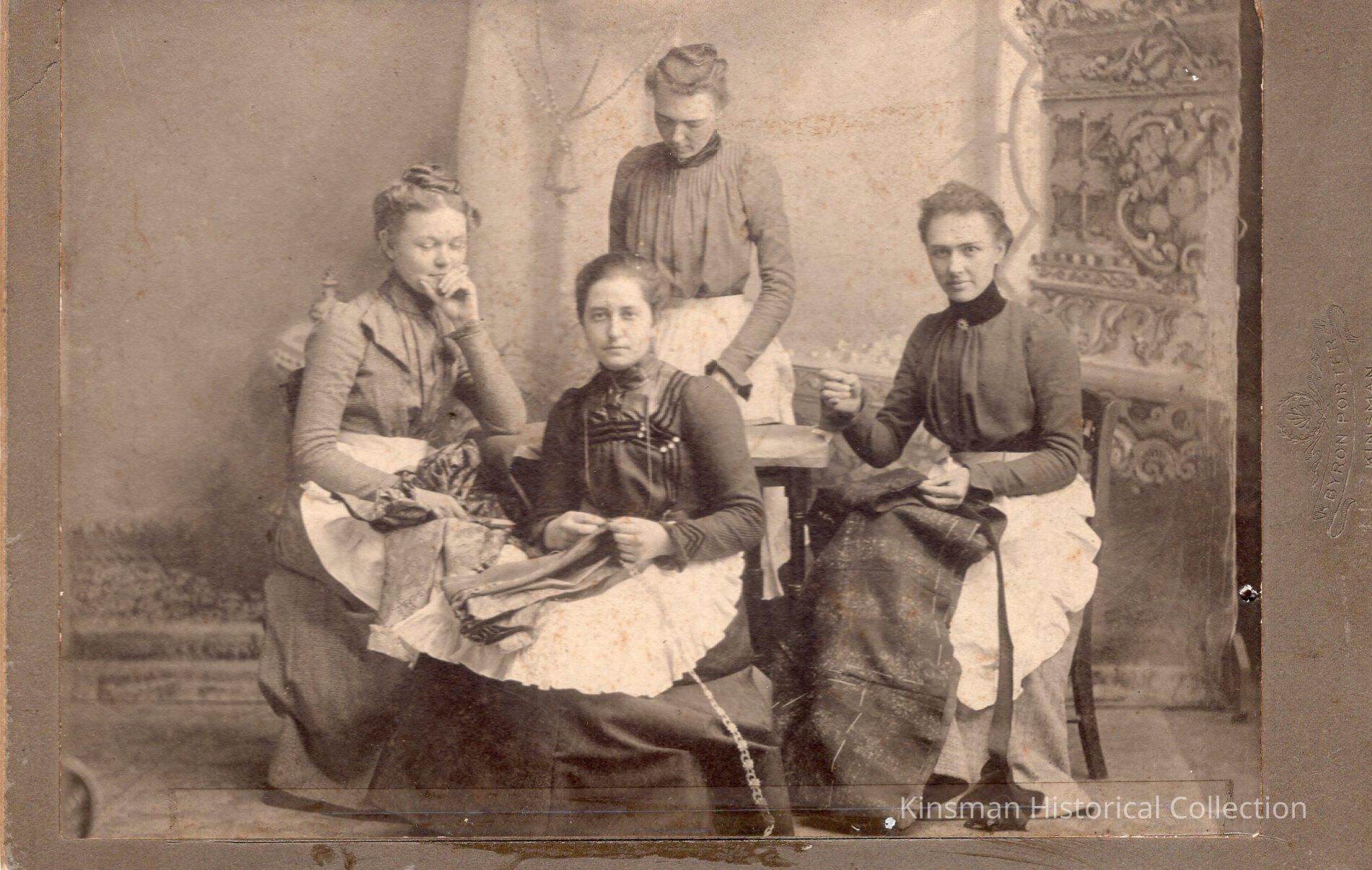 Group of women sewing identified as Lillian McKinnie standing behind (L to R) Lizzie McClyster, Mary Scott, and Mame McKinnie in their shop above the South Store (present day Market Square). For about 30 years at the turn of the century, fashionable ladies of Kinsman and surrounding towns would have their gowns made by these dressmakers.Cataloged By