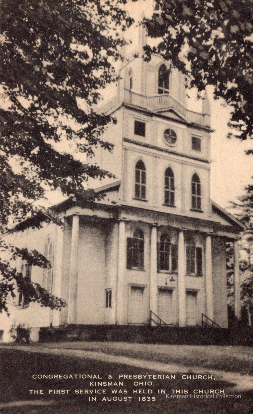 "Congregational & Presbyterian Church, Kinsman, Ohio. The first service was held in this church in August 1835". Written postcard on the back dated October 1944.Collection