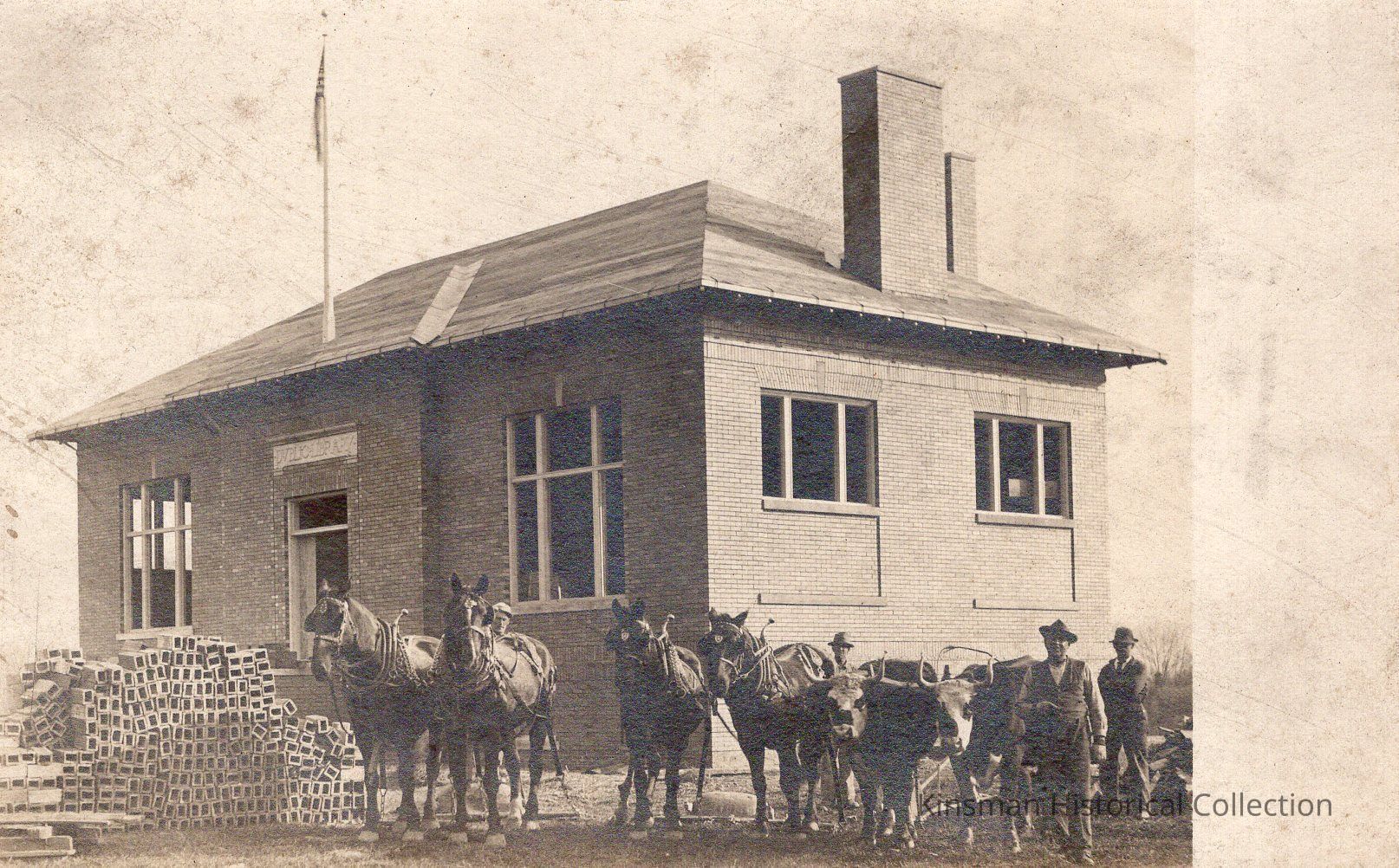 Oxen and horses bringing building materials for the construction of Kinsman Free Public Library established in 1913. David McClean photographed to the right of his oxen.Collection