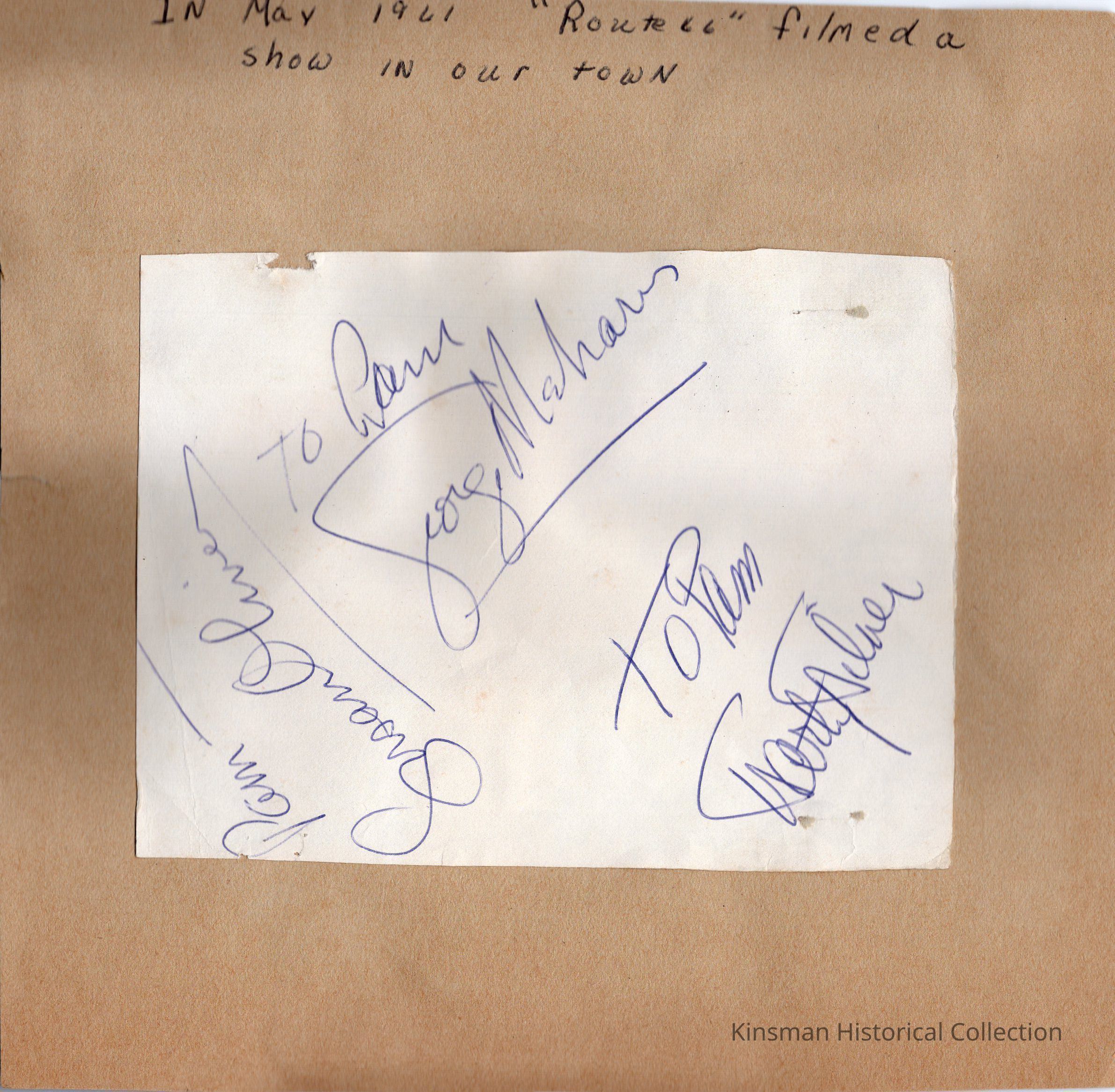A collection of autographs "To Pam" from celebrities George Maharis, Susan Oliver, and Martin Milner that visited Kinsman during the filming of the show Route 66 in May of 1961. On the back are images identified as Niagara Falls in [2023.1.14] from June 1959 including portraits of "Candy" by a fountain and "Me, Linnie, Candy" on a foot bridge.Cataloged By