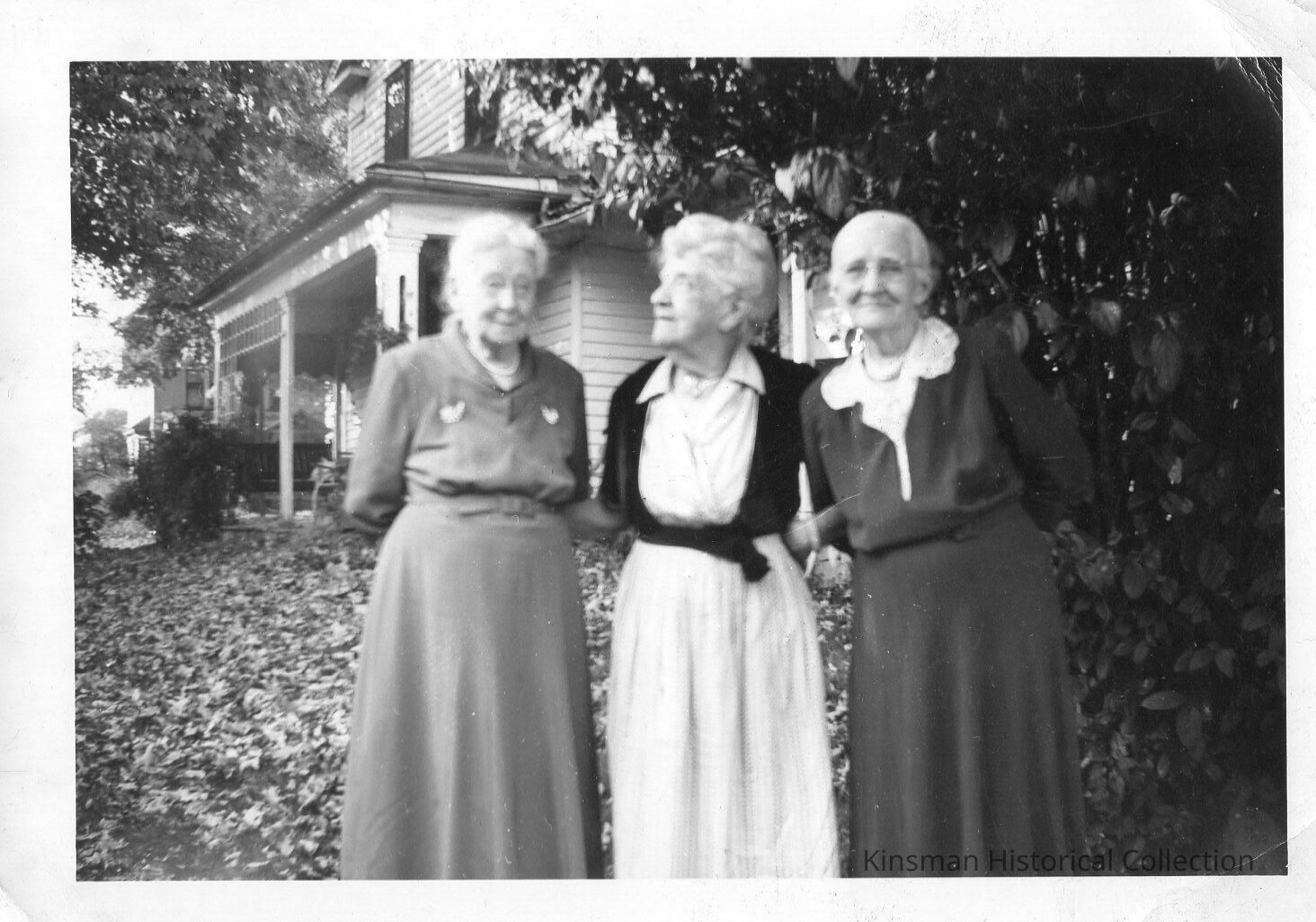 Three women standing in front of house. Writing on back "The Three Musketeers [unreadable month] 1951".Collection