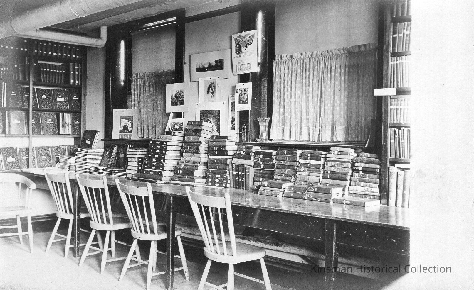 Long table lined with books, possibly the same room as [2022.1.247] Old Kinsman Library.Collection