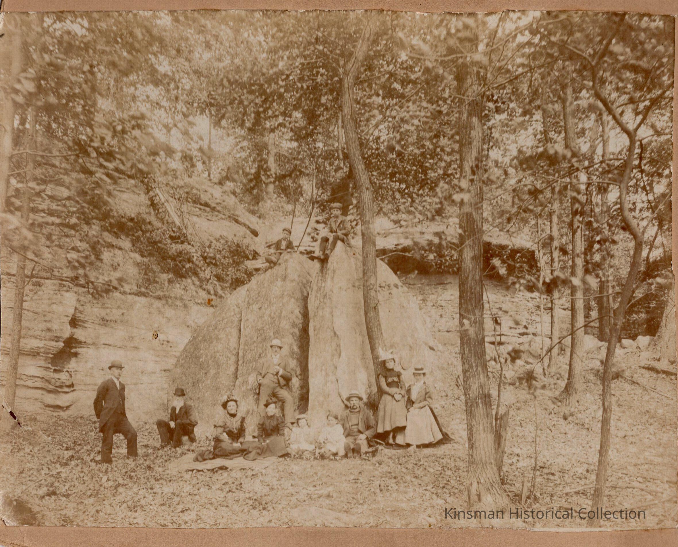 Group of Kinsman and Farmdale residents on an outing to Hartford Ledges circ 1880. Members identified as Dewiltt Tower Root, Mr. Burnett, Mrs. D. T. Root (Ruth Allen Root), Lucy Allen, Kay Crocker, Ruth Allen (Lucy's daughter), Mildred Root with pug dog Scraps, Dan Allen, Ida Root, Ella Crocker, and on top of the rock, Adren Root, Walter Burnett, and Asahel Root.