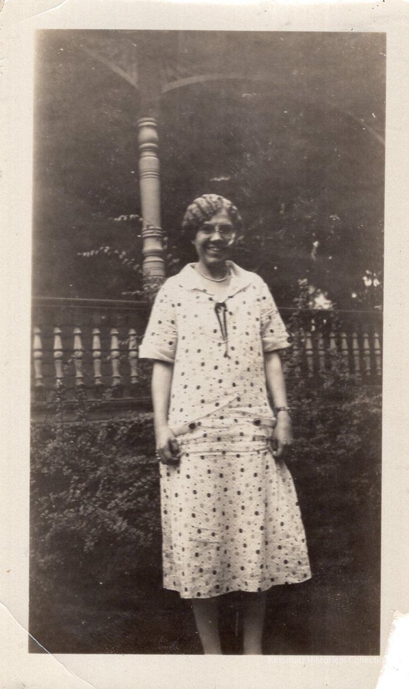 Elsie Milne, wearing a polka dot dress, standing in front of porch.Collection