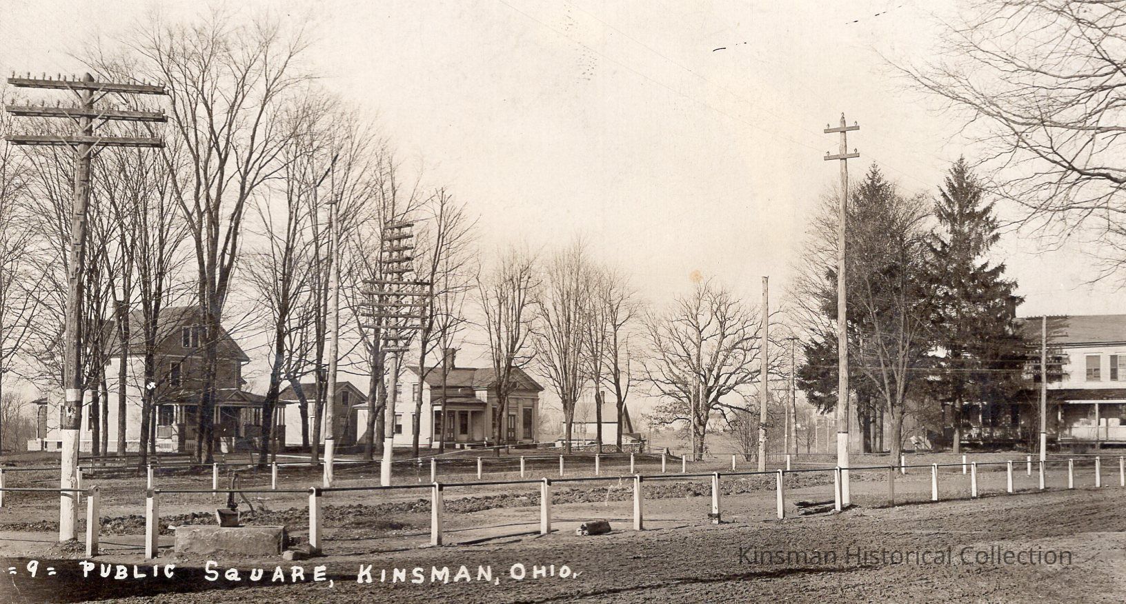 The Public Square in Kinsman, Ohio showing a ring of hitching posts.Collection