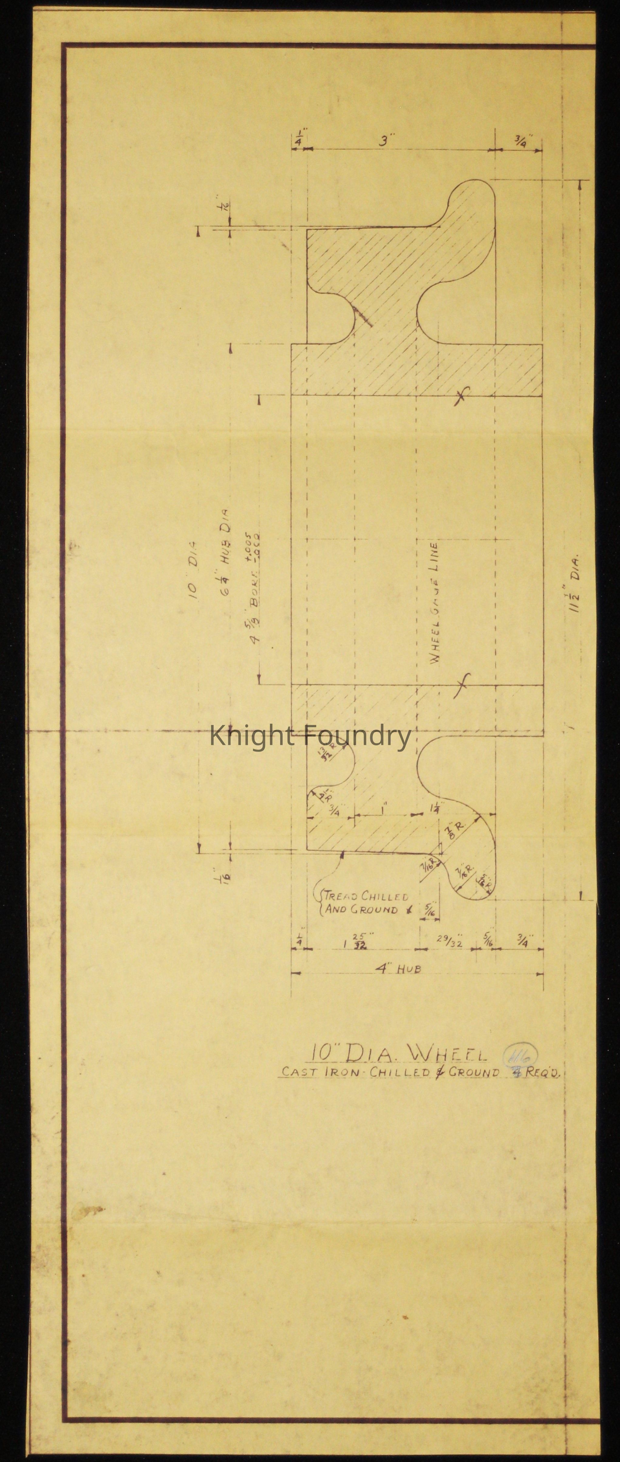10 in diameter wheel, cast iron - chilled & ground. Print is a portion of a larger drawing. Note on back "Sacto Eng, Car wheels"Collection