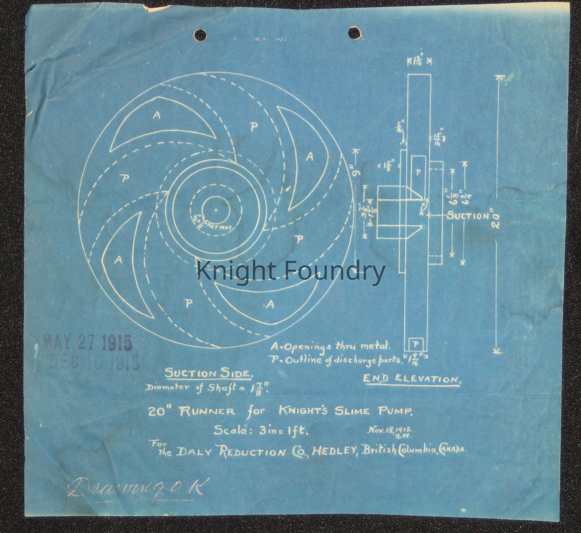 Blueprint of 20 ft runner for Knight's slime pump for the Daly Reduction Co., Hedley, British Columbia, Canada. " Drawing OK" Stamped with dates May 27, 1915 and Dec. 16, 1915Collection