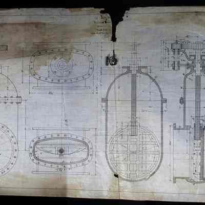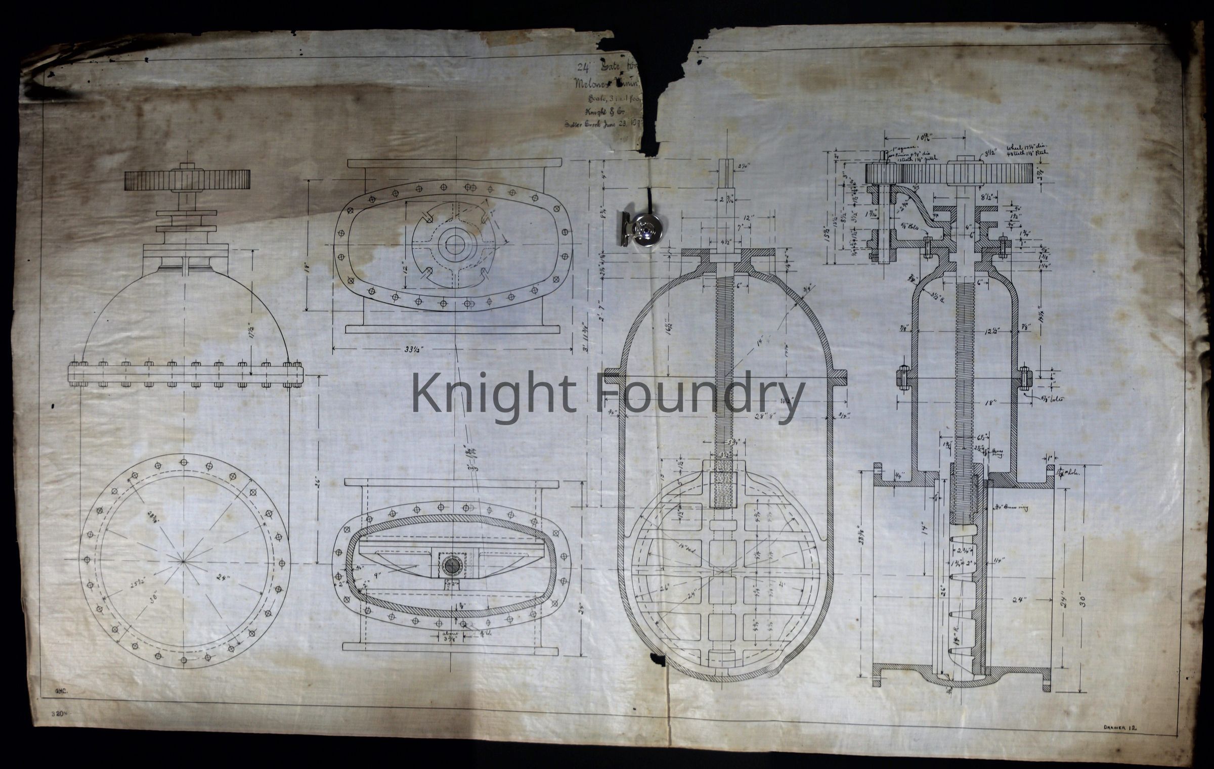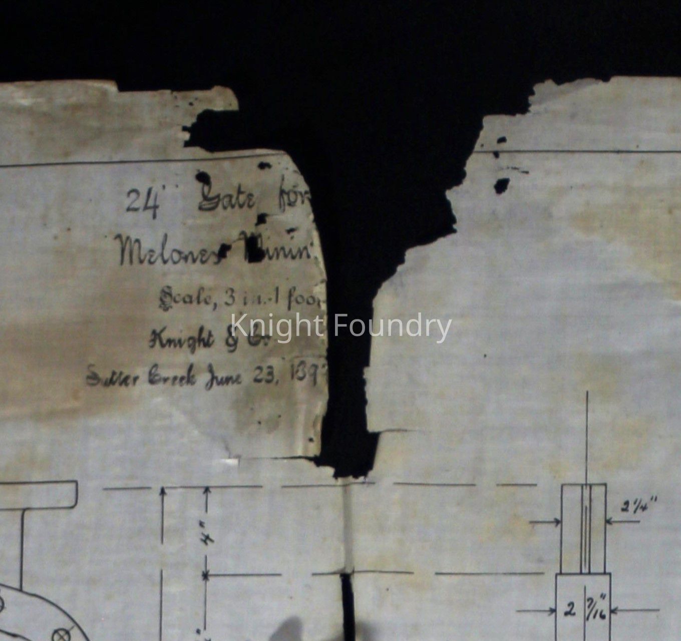 A drawing of a 24" gate valve produced for the Melones Mining Company. The scale is 3 inches equals 1 foot. Drawing is marked drawer 12.Collection