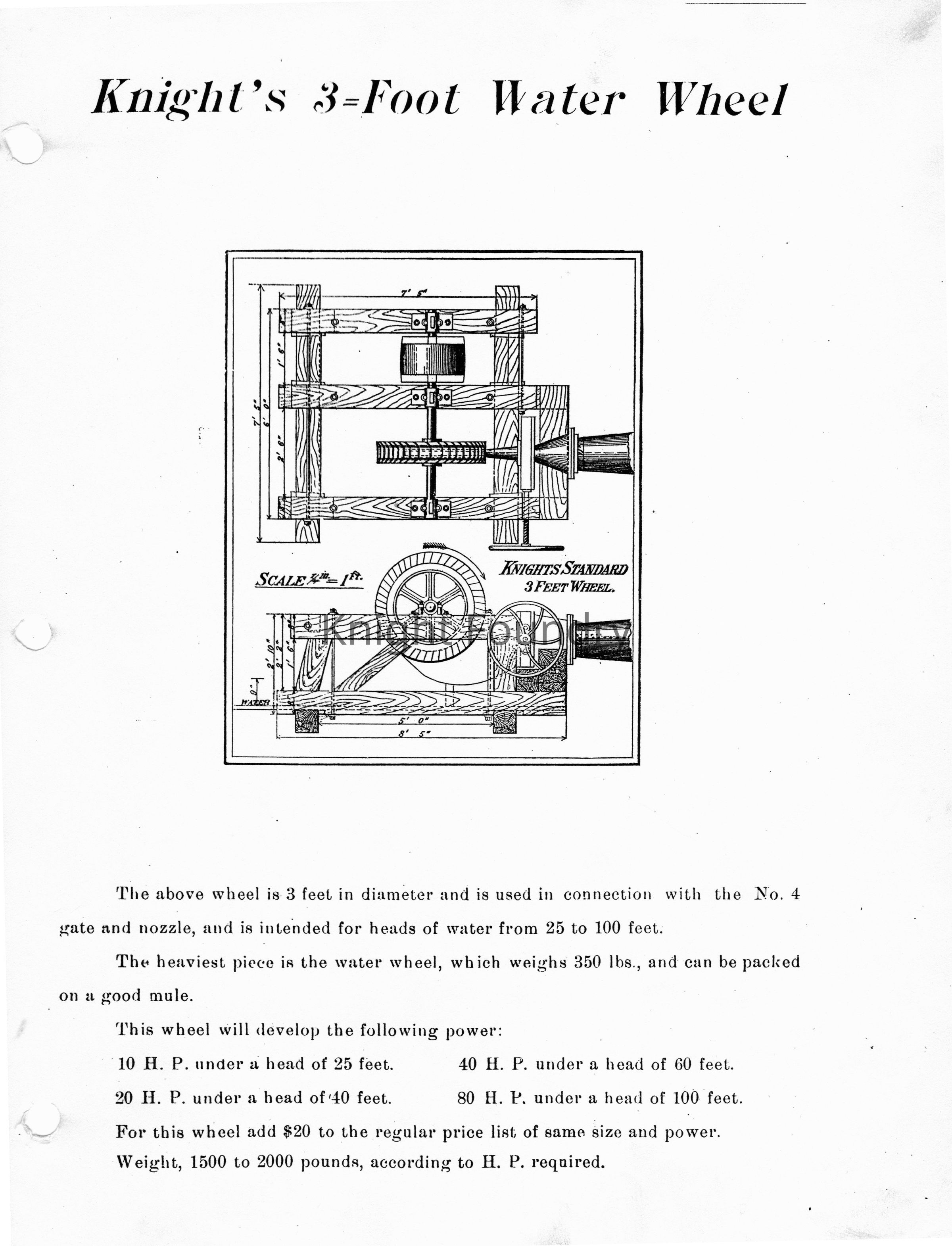 Photocopy of a drawing of Knight's 3 foot water wheel from a Knight catalog, including application information.