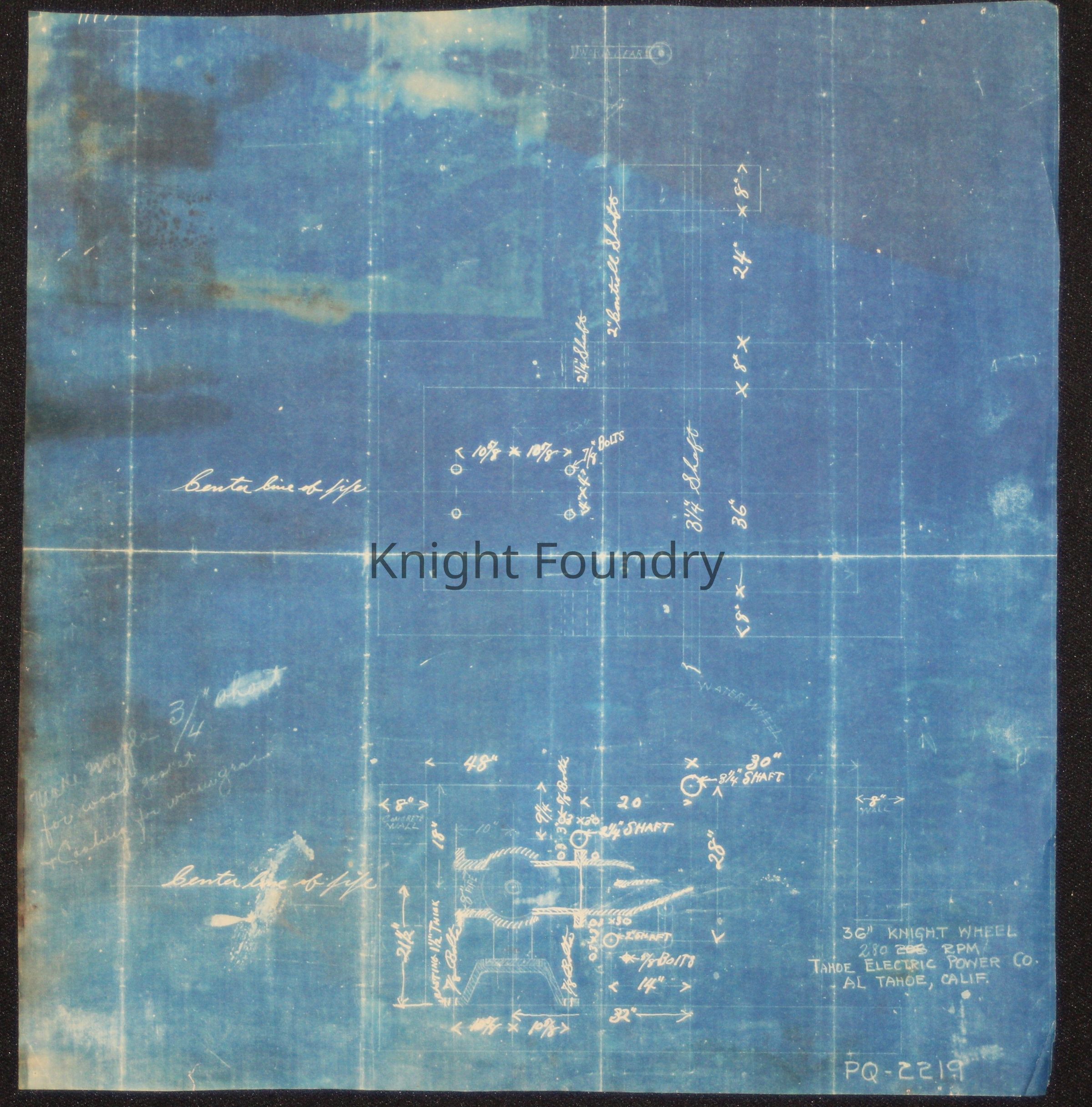 Blueprint of 36 in Knight Wheel, 280 RPM, Tahoe Electric Power Co., AL Tahoe, Calif. Drawing # PQ-2219. Drawing appears to include notes added to an earlier drawing showing nozzle installation details. Includes note: "Make nozzle 3/4 in short for good gasket & casing for worm gear"Collection
