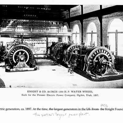 Photocopy of a drawing of Knight & Co. 58 inch 1200 H.P. water wheels in place at the Pioneer Electric Power Company, Ogden, Utah. Shows hydroelectric generators, C. 1897. At the time, this was the nation's largest power plant.Artwork Details
